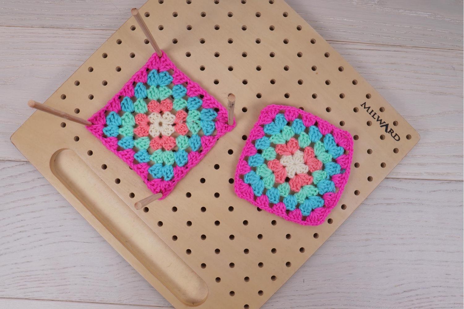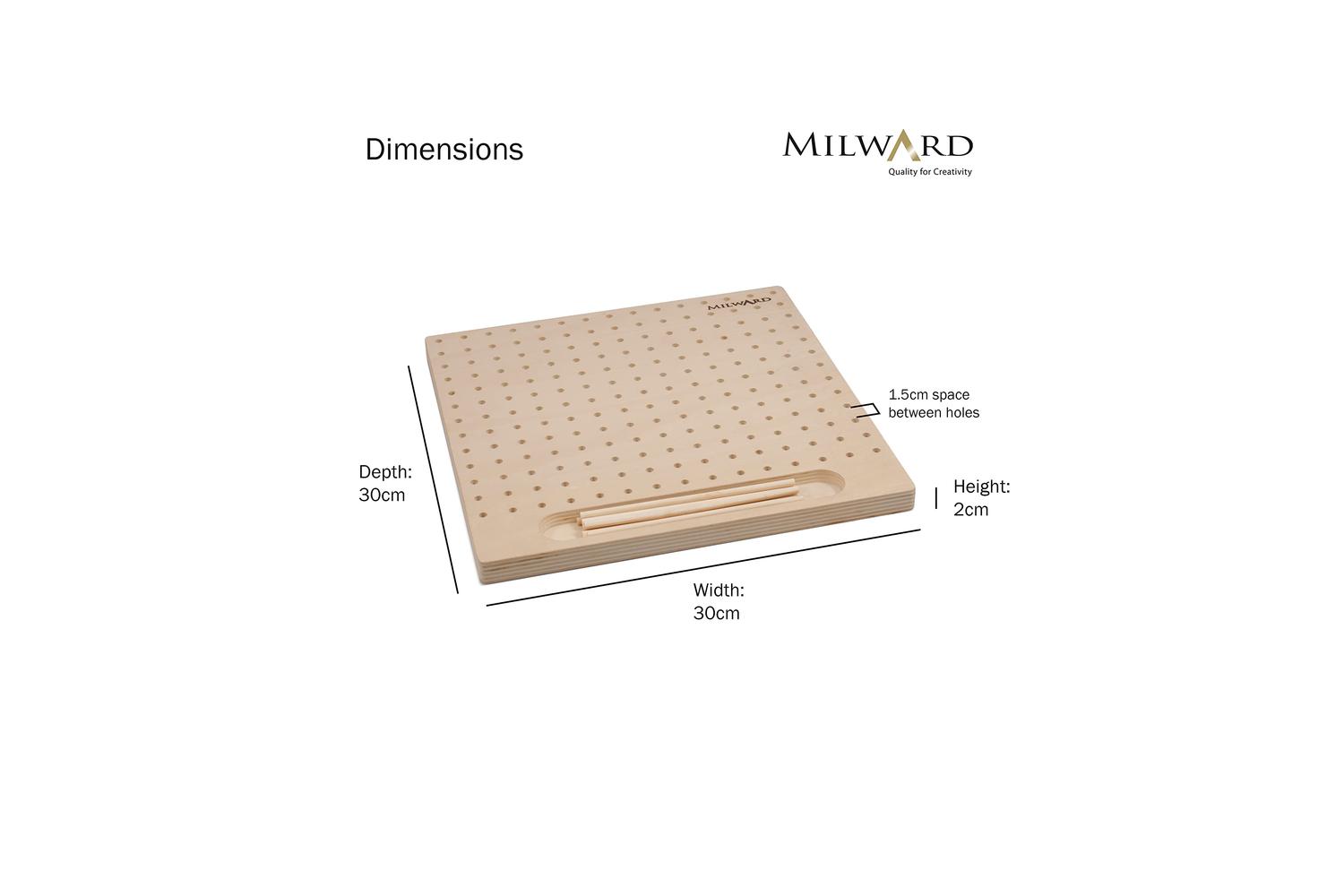 Aids flattening of crochet to create homeware and crafts. Suitable for many shapes and sizes due to the ability to move pegs as you wish. Recess channel to store pins. Comes with 12 pins. Laser etched Milward logo. (d/w/h): 2 x 30 x 30cm.
