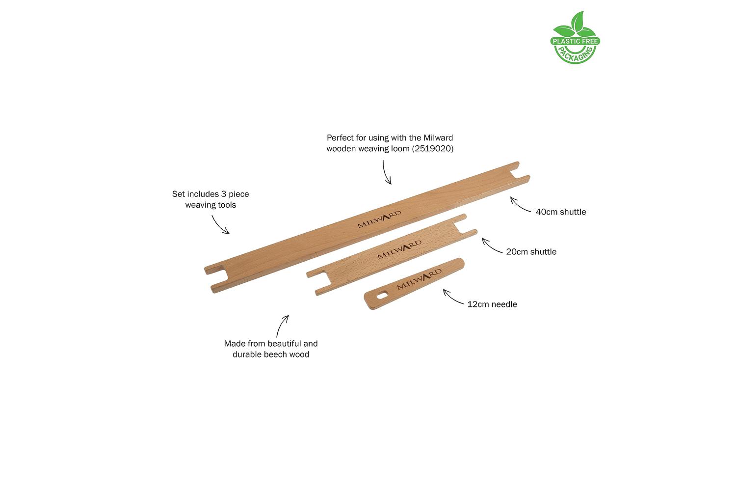 Perfect addition to use with our Milward Weaving Loom, 2519020. Set of essential wooden weaving loom tools. Set includes: 1 x 40cm shuttle, 1 x 20cm shuttle and 1 x 12cm needle. Lovely smooth beech wood with Milward logo.