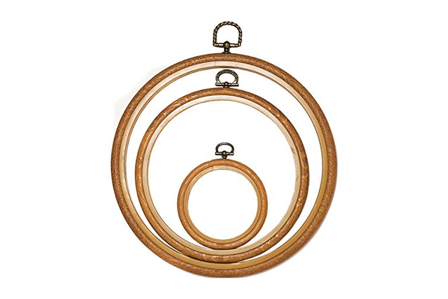 Description: Circular, plastic imitation wood frame to display needlecraft pieces.