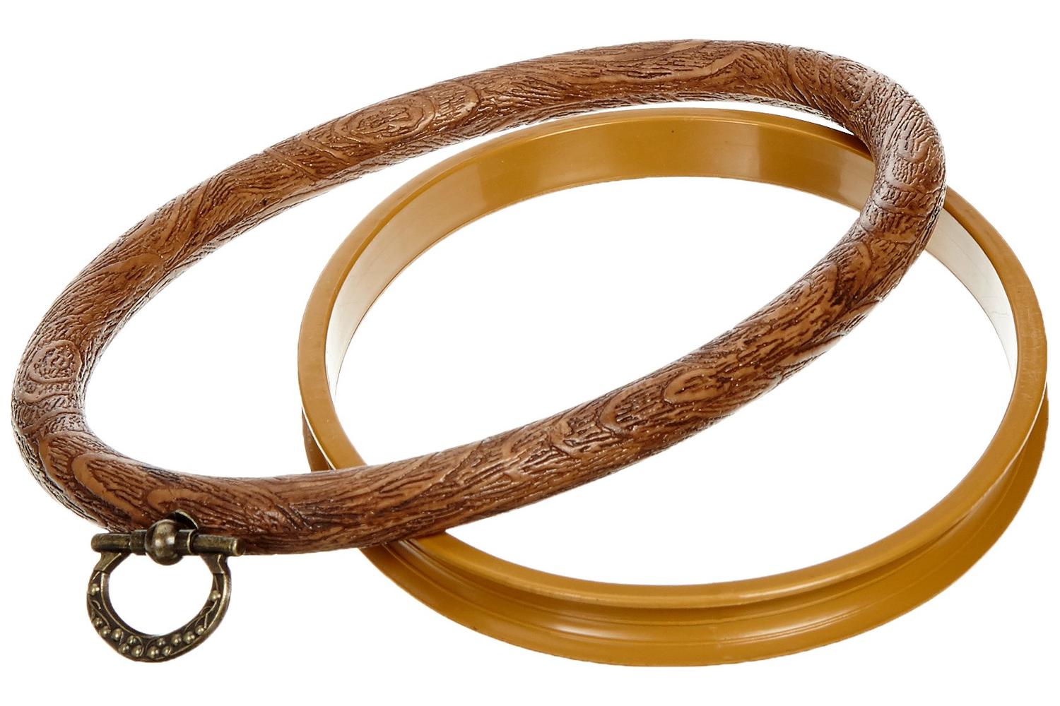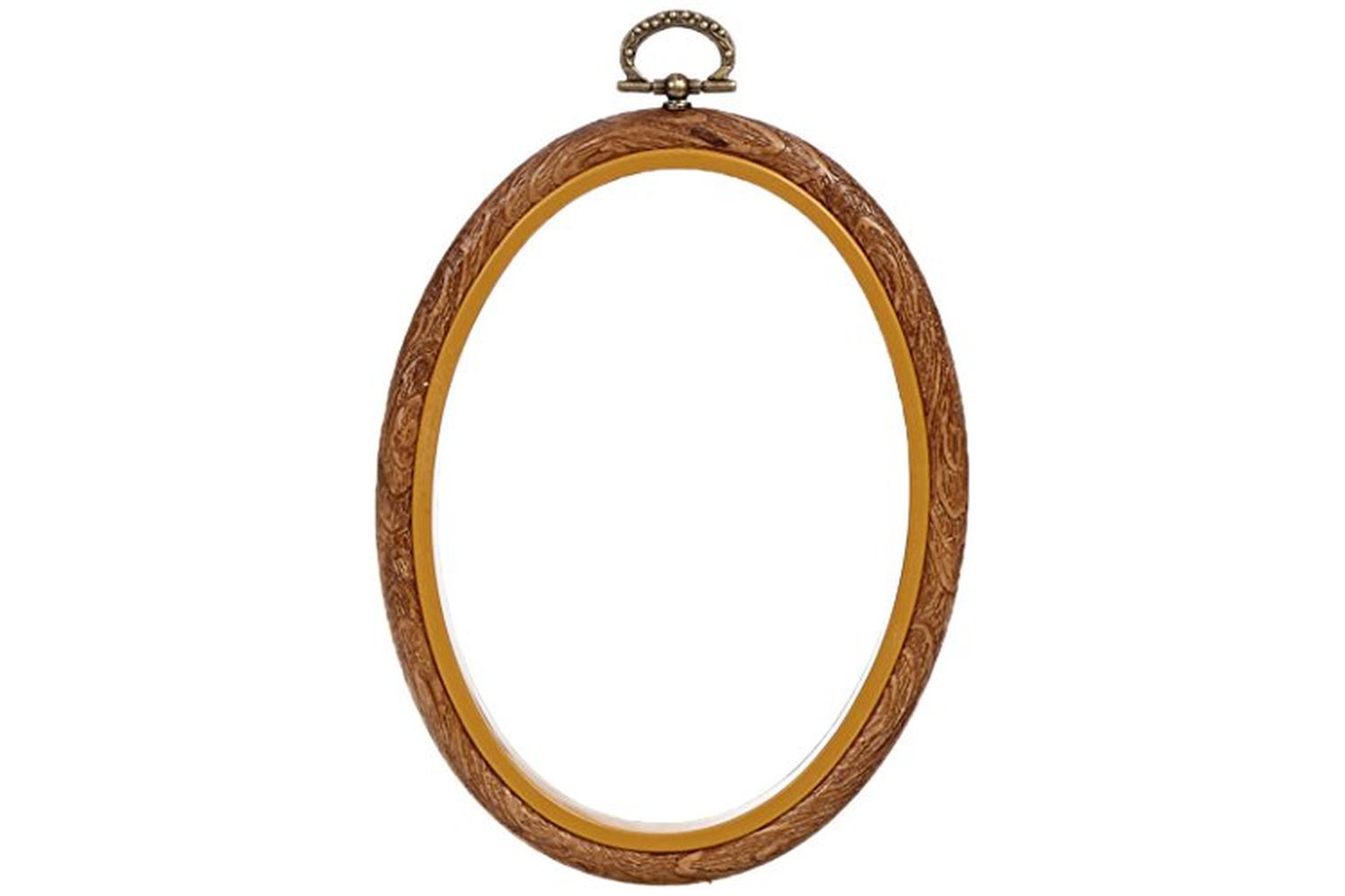 Oval, plastic imitation wood frame to display needlecraft pieces.