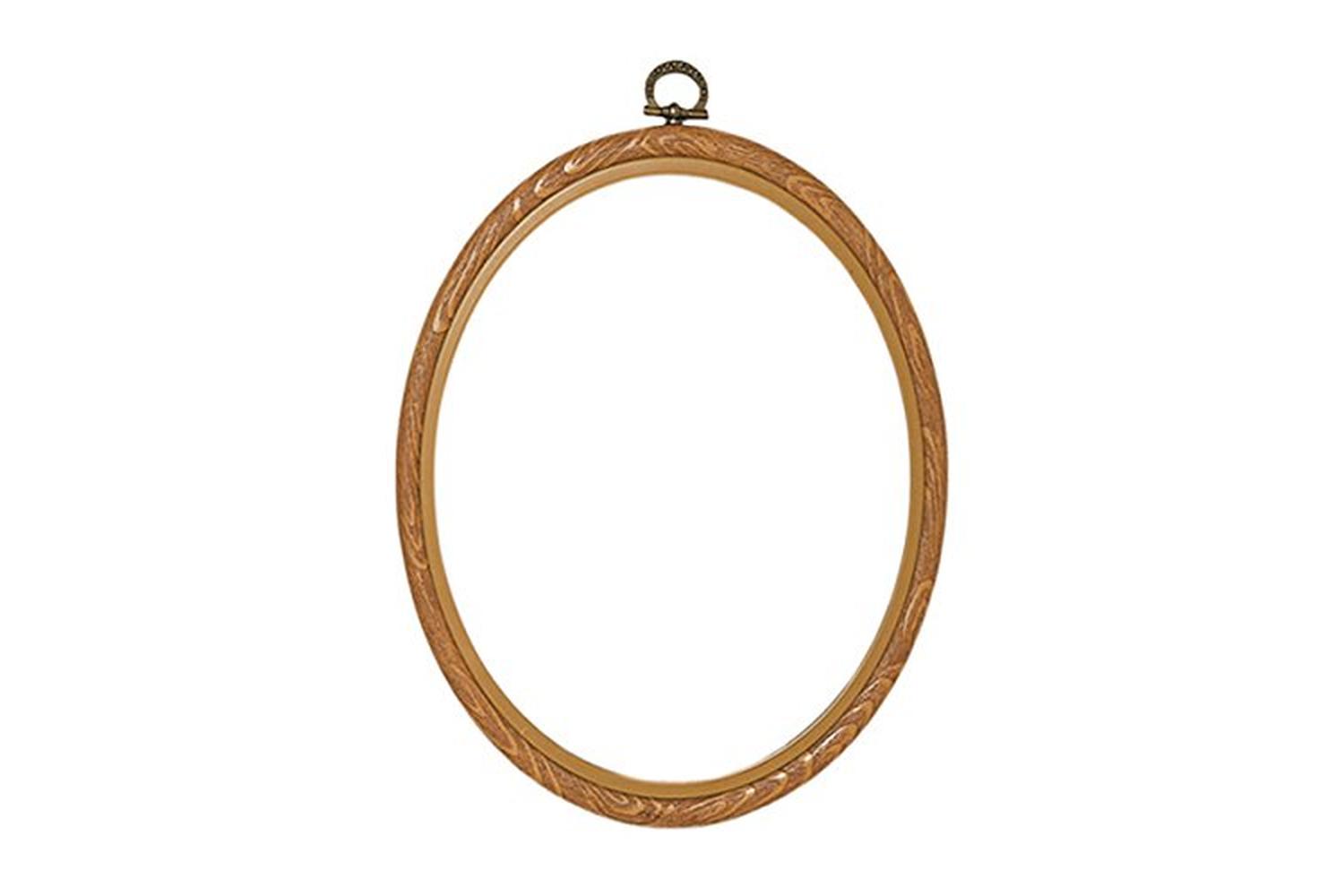 Description: Oval, plastic imitation wood frame to display needlecraft pieces.