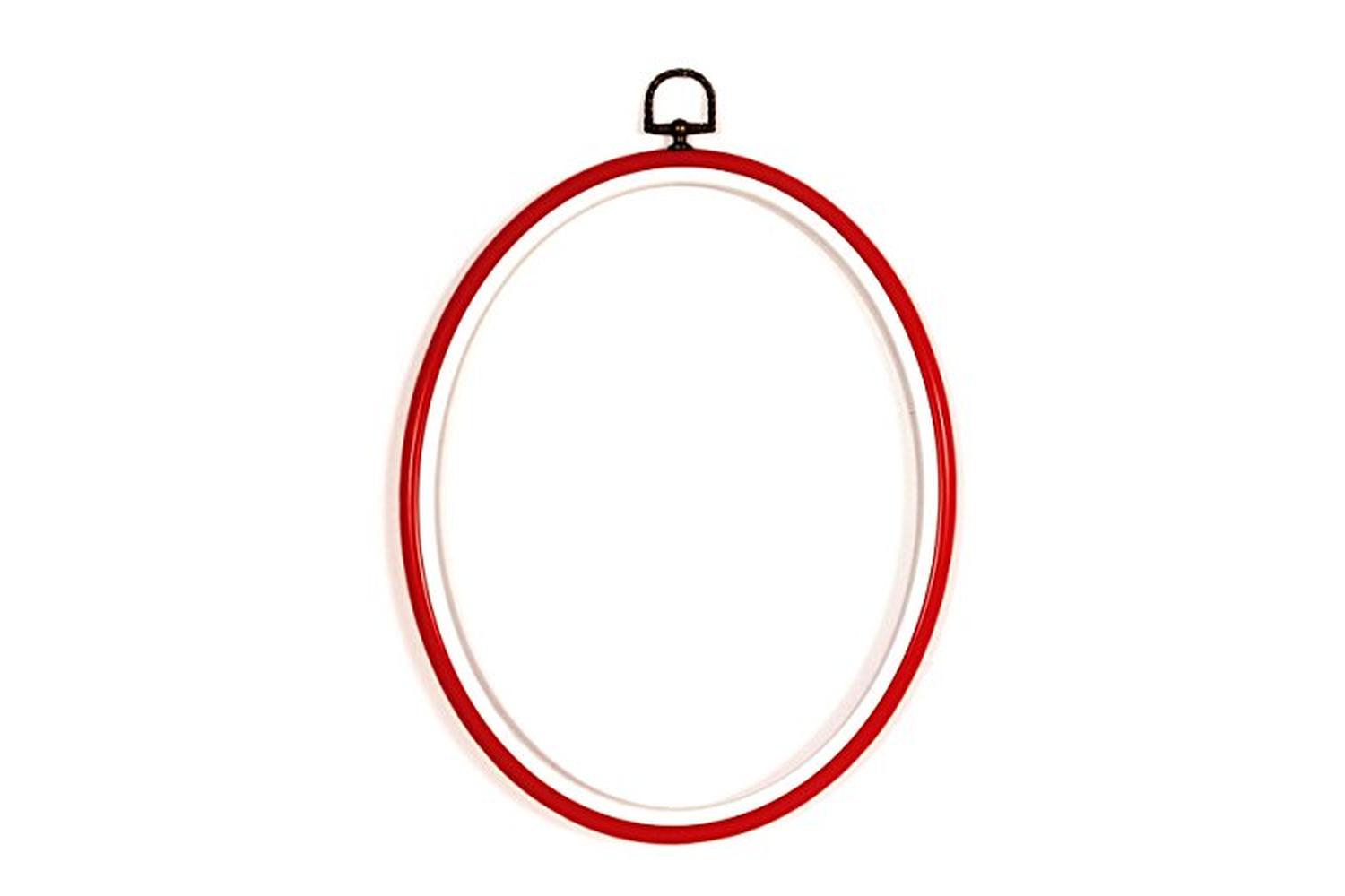 Oval, plastic frame to display needlecraft pieces.