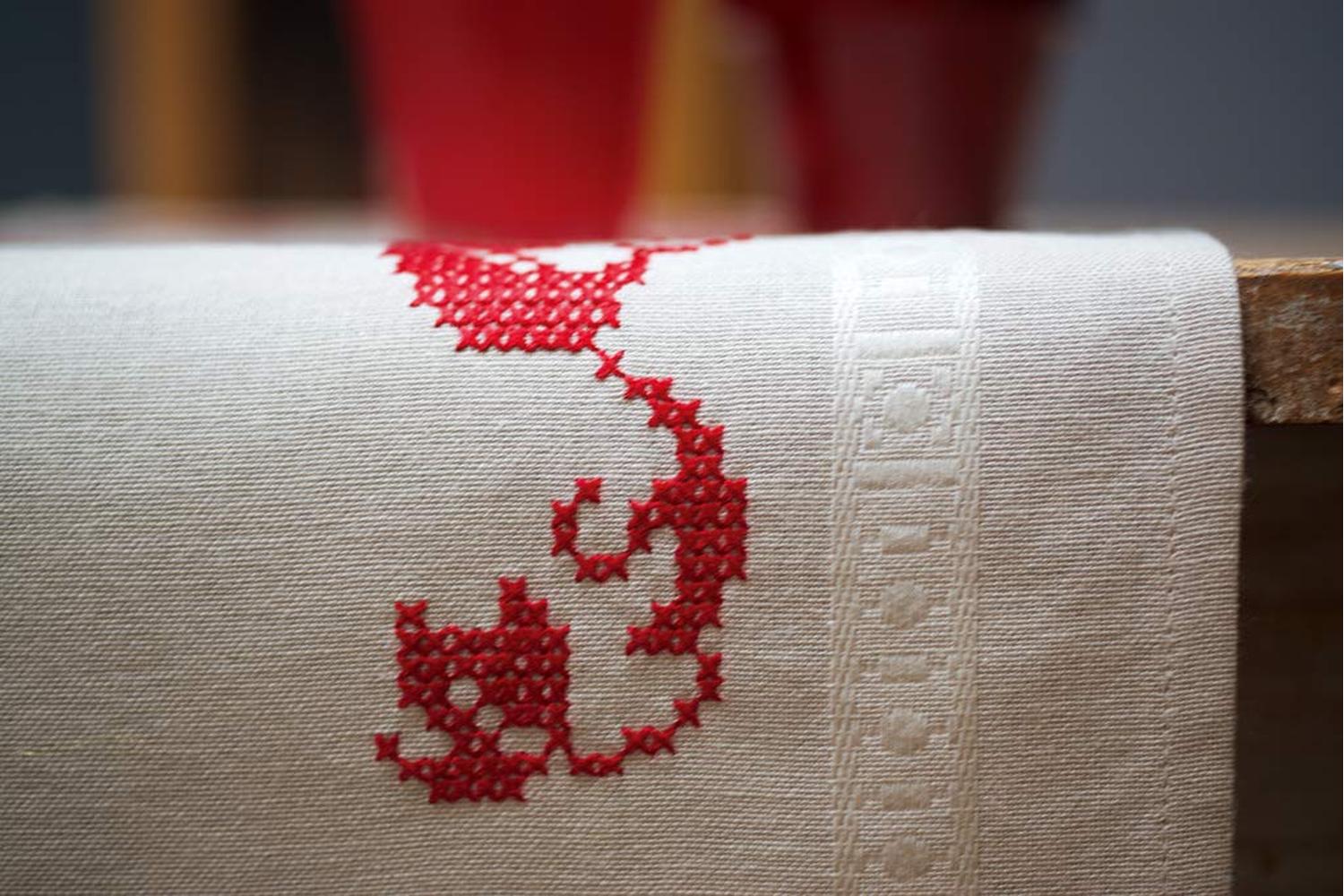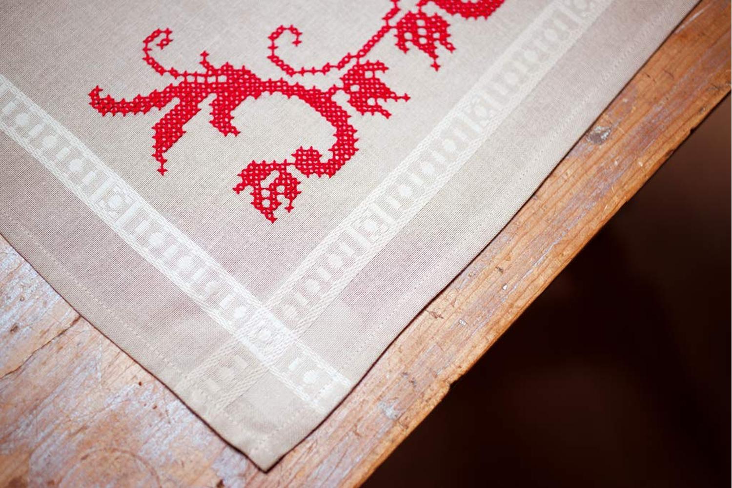 Description: Embroidered table runner. Printed design to be stitched with pre-sorted cotton threads onto beige, cotton fabric with hemmed, inwoven border. Kit also includes instructions in 8 languages (ENG, NL, FR, GER, IT, SP, RU, SW), large-square design, needle, front sheet picture. The printed design will wash out. Approximate finished size: (w/l) 40 x 100cm or 16 x 40in. Age category: from 15 years. Difficulty level: very easy. Stitches used: cross stitch.