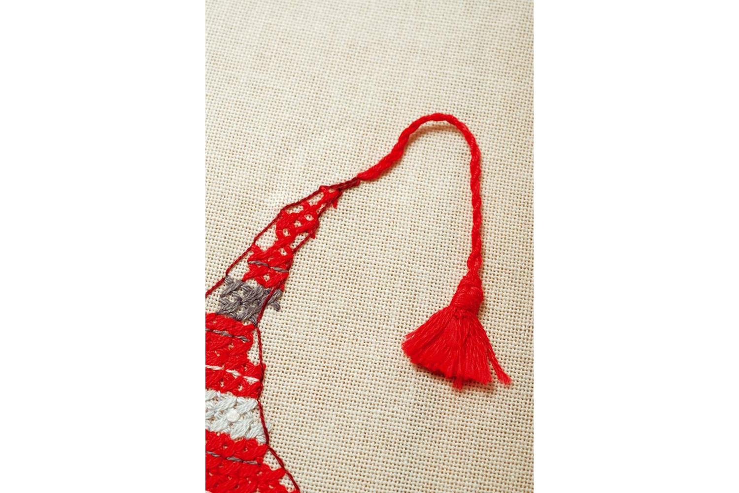 Description: Embroidered table runner. Printed design to be stitched with pre-sorted cotton threads onto ecru, cotton fabric with hemmed, inwoven border. Kit also includes instructions in 8 languages (ENG, NL, FR, GER, IT, SP, RU, SW), large-square design, needle, front sheet picture and red tassels for elves' hats. The printed design will wash out. Approximate finished size: (w/l) 40 x 100cm or 16 x 40in. Age category: from 15 years. Difficulty level: difficult. Stitches used: French knot, cross stitch, long stitch, back stitch.