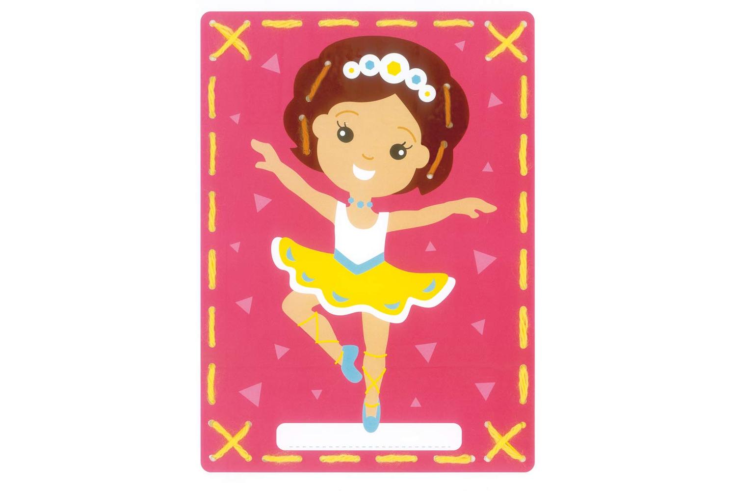 Embroidery kit of 2 cards. Perforated designs to be embroidered with thick acrylic yarn. Kit also includes: plastic needle; frontsheet picture; instructions in eight languages (ENG, NL, FR, GER, IT, SP, RU, SW). Approximate finished size: (w/h) 18.5 x 26cm or 7.4 x 10.4in. Age category: from 4 years. Difficulty level: very easy. Stitches used: running stitch.