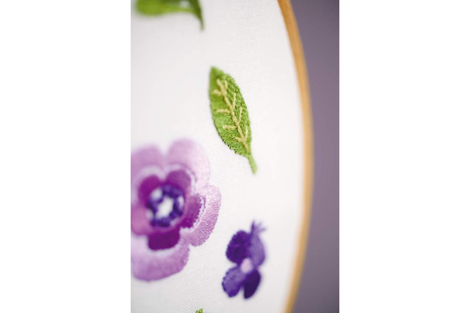 Description: Embroidery kit with ring. Design to be embroidered with pre-sorted cotton threads onto white, polycotton embroidery fabric. Kit also includes: instructions in eight languages (ENG, NL, FR, GER, IT, SP, RU, SW); chart; needle; front sheet picture and wooden embroidery ring. Approximate finished size: (w/h) 20cm or 8in. Age category: from 18 years. Difficulty level: difficult. Stitches used: French knot, satin stitch, stem stitch.