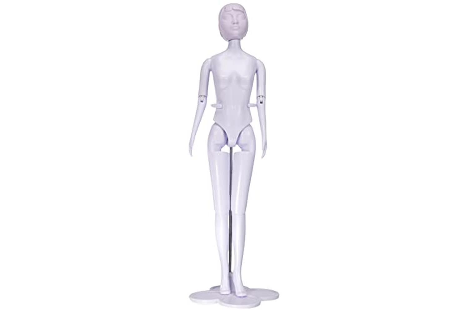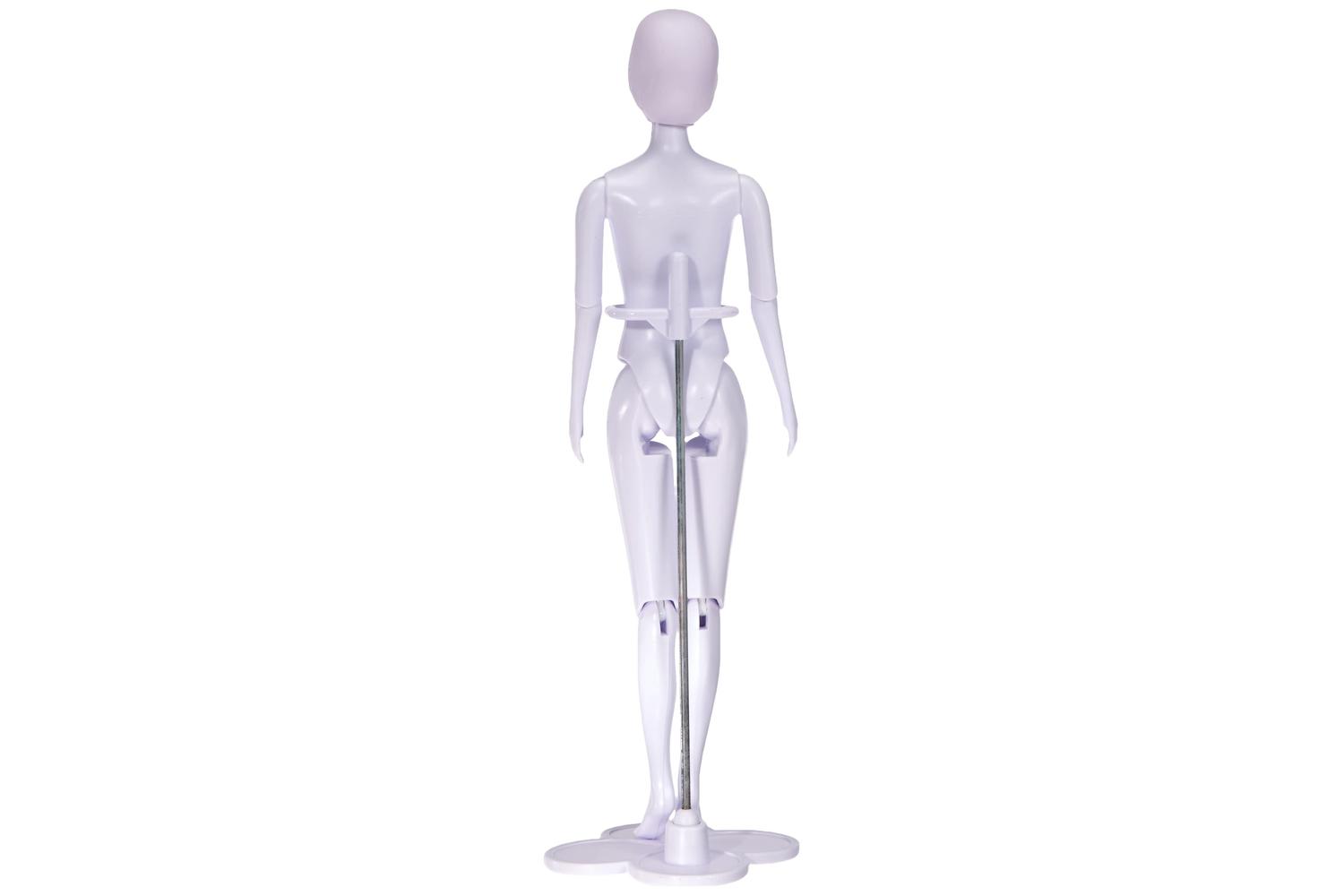 Naturally proportioned 29cm white mannequin doll with stand. Presented in a splendid box that can also serve as a fitting room.