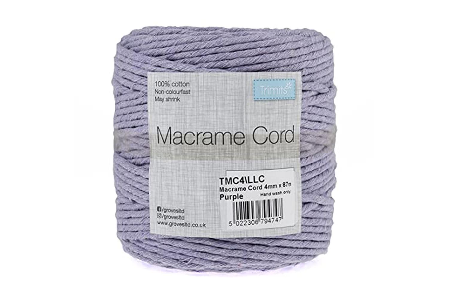 Description: Lilac macramé cord, perfect for a range of projects such as wall hangings, decorations, home décor, key chains or jewellery. Sold on spools. Made from 100% cotton. May shrink when washed. Handwash only. Not colour fast.