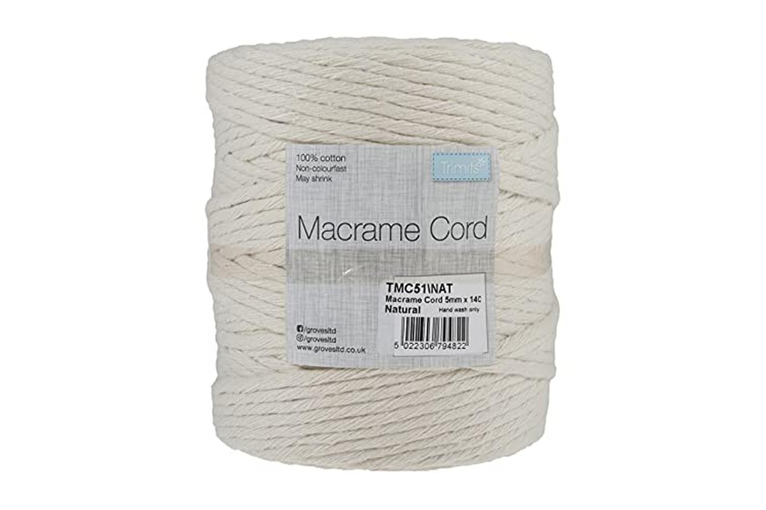 Natural macramé cord, perfect for a range of projects such as wall hangings, decorations, home décor, key chains or jewellery. Sold on spools. Made from 100% cotton. Hand wash only. May shrink when washed.
