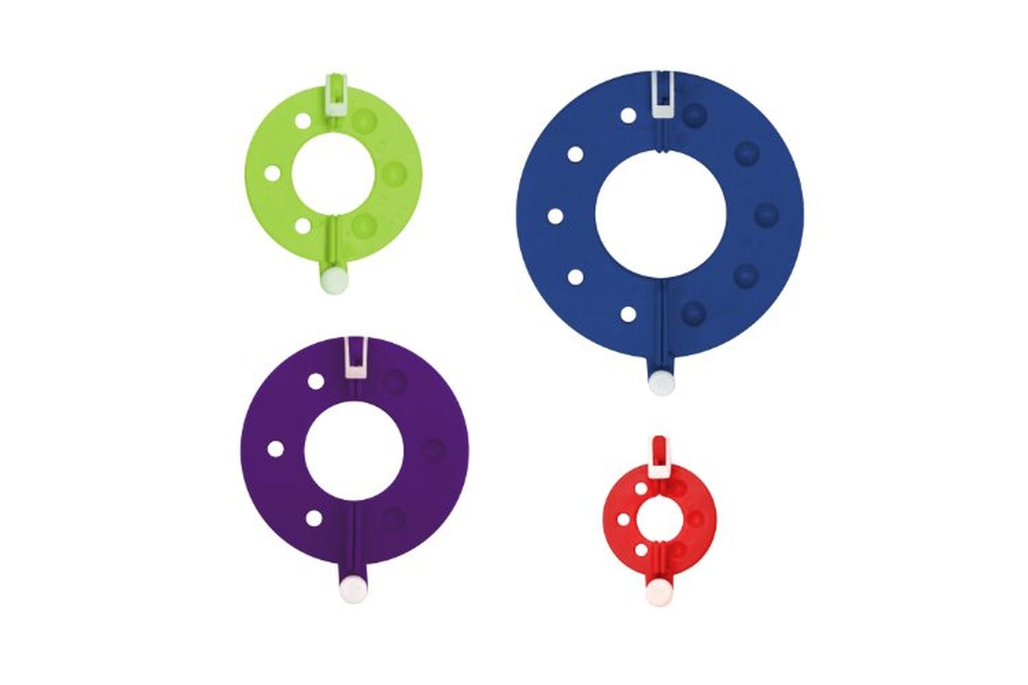 This pack contains four split pom-pom makers - 3.5cm, 5.5cm, 7cm and 9cm.