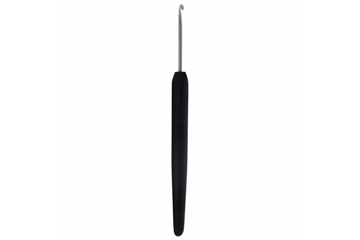 Description: This crochet hook has a silver end and a black soft grip handle for comfort in use.