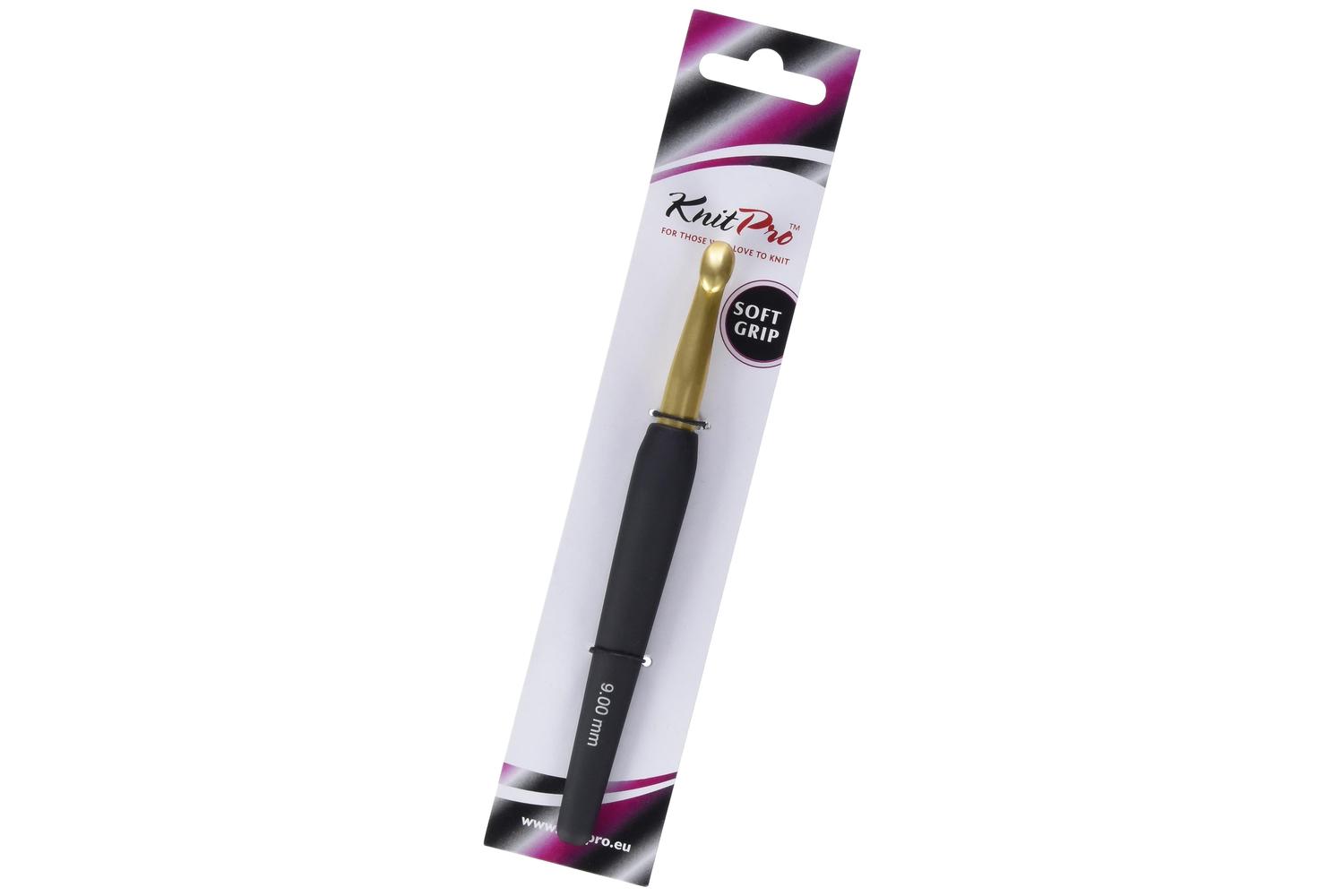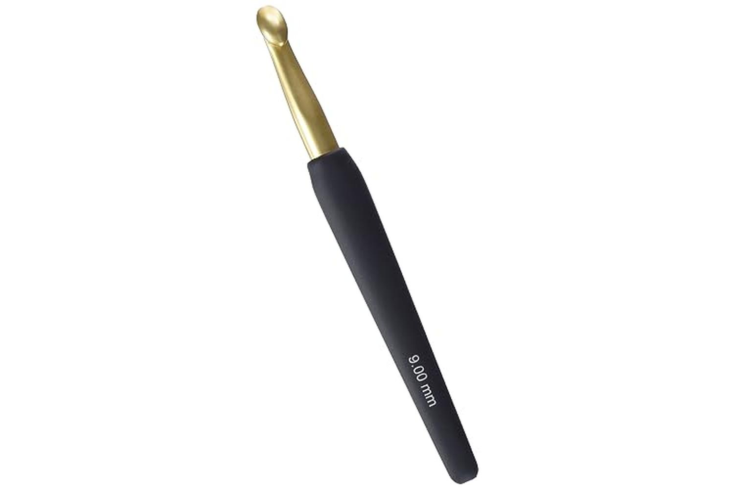 Description: This crochet hook has a gold coloured aluminium hook end and a black soft grip handle for comfort in use. Length: 15cm.