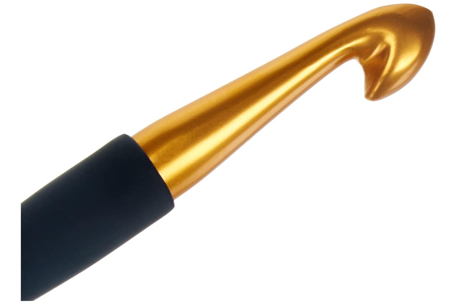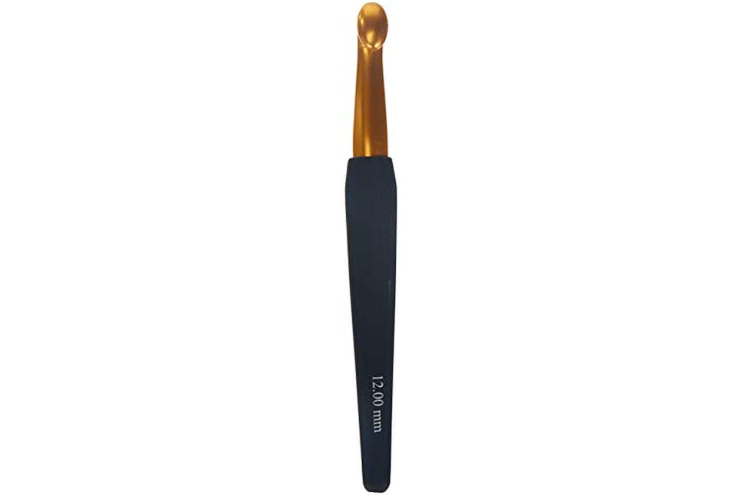 Description: This crochet hook has a gold coloured aluminium hook end and a black soft grip handle for comfort in use. Length: 15cm.