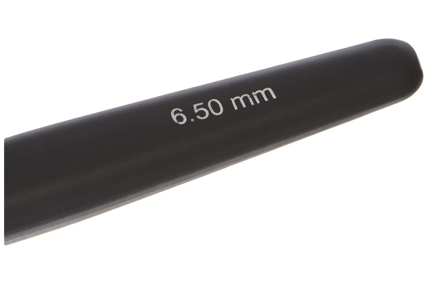 This crochet hook has a silver coloured aluminium hook end and a black soft grip handle for comfort in use. Length: 15cm.
