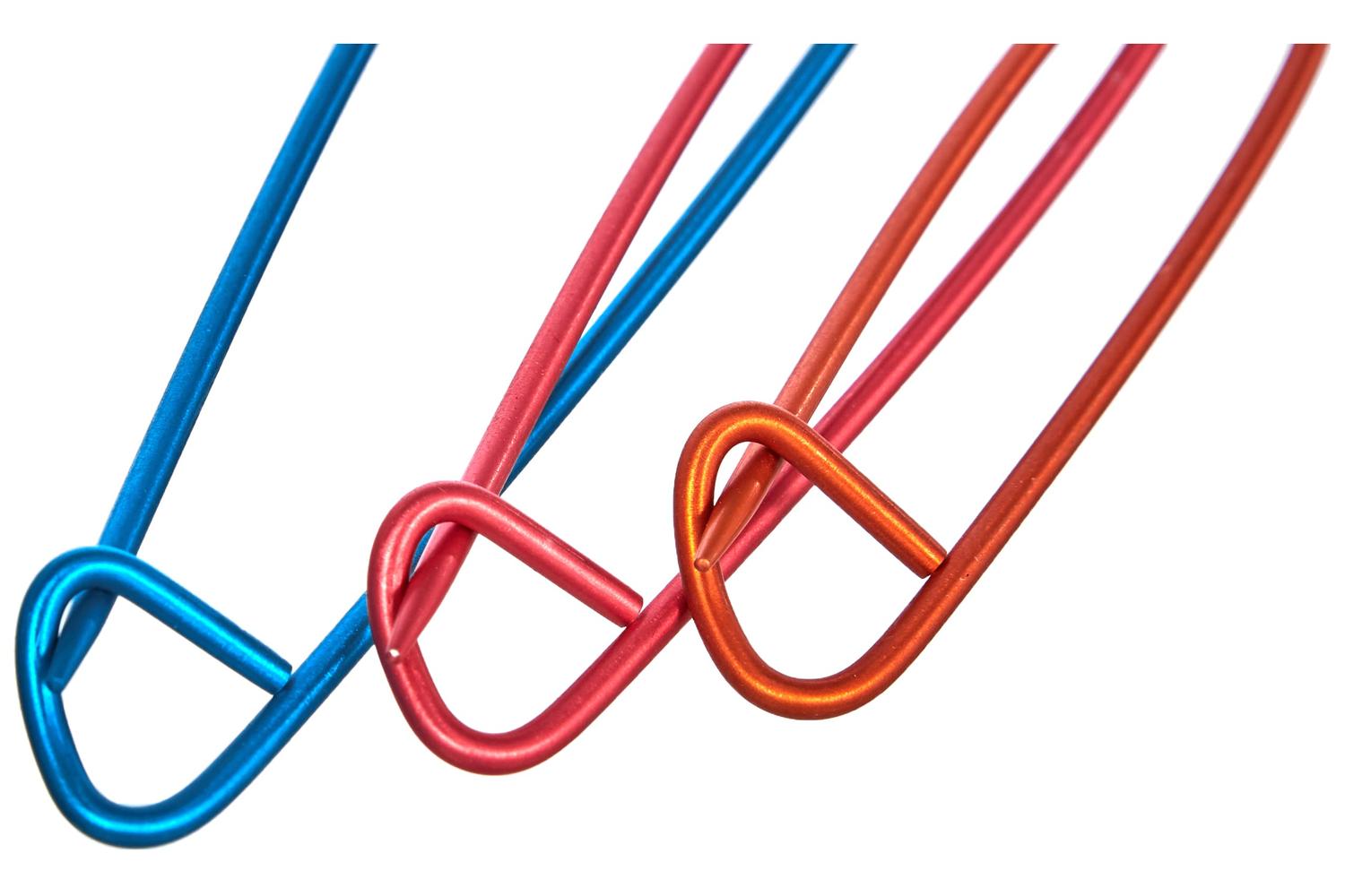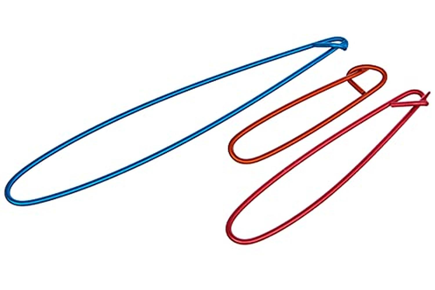 Set of 3 aluminium stitch holders: large 6.50in, medium 4.5in, small 3.25in. Essential knitting tools used to separate stitches when knitting collars, cable patterns or when using different yarns. They close like safety pins and the secure locking design makes it easy to hold stitches without snagging your knit.