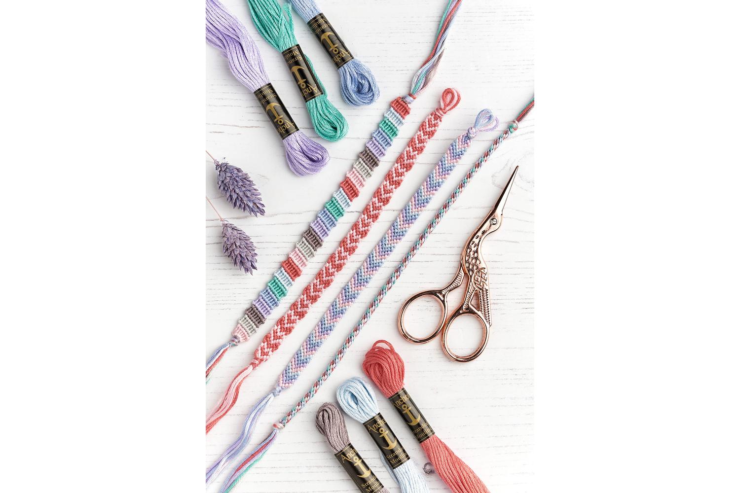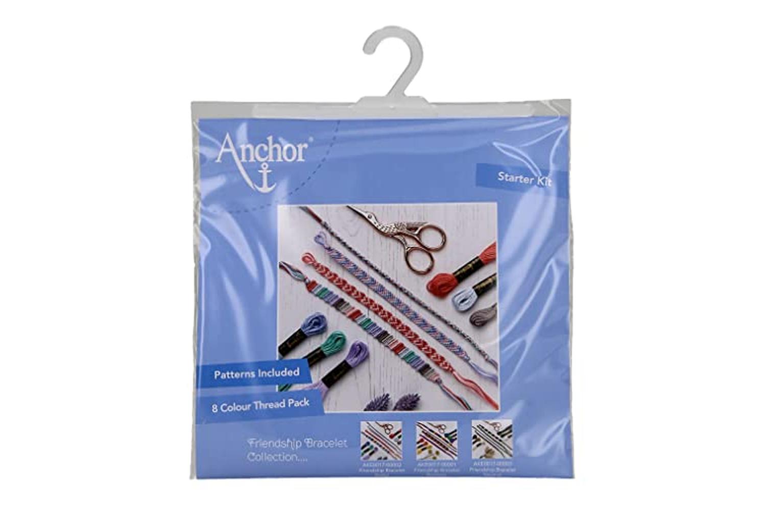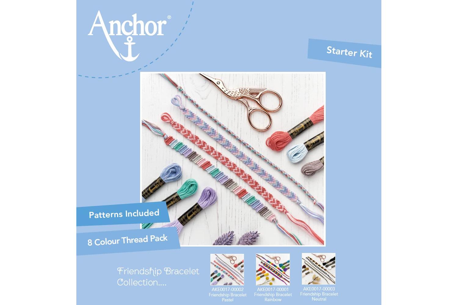 Description: Friendship bracelet kit. Three kits available each with a different assortment of 8 shades. Kit includes: 8 skeins of Anchor stranded cotton thread; step-by-step instructions; 4 designs. Skill level: 1.