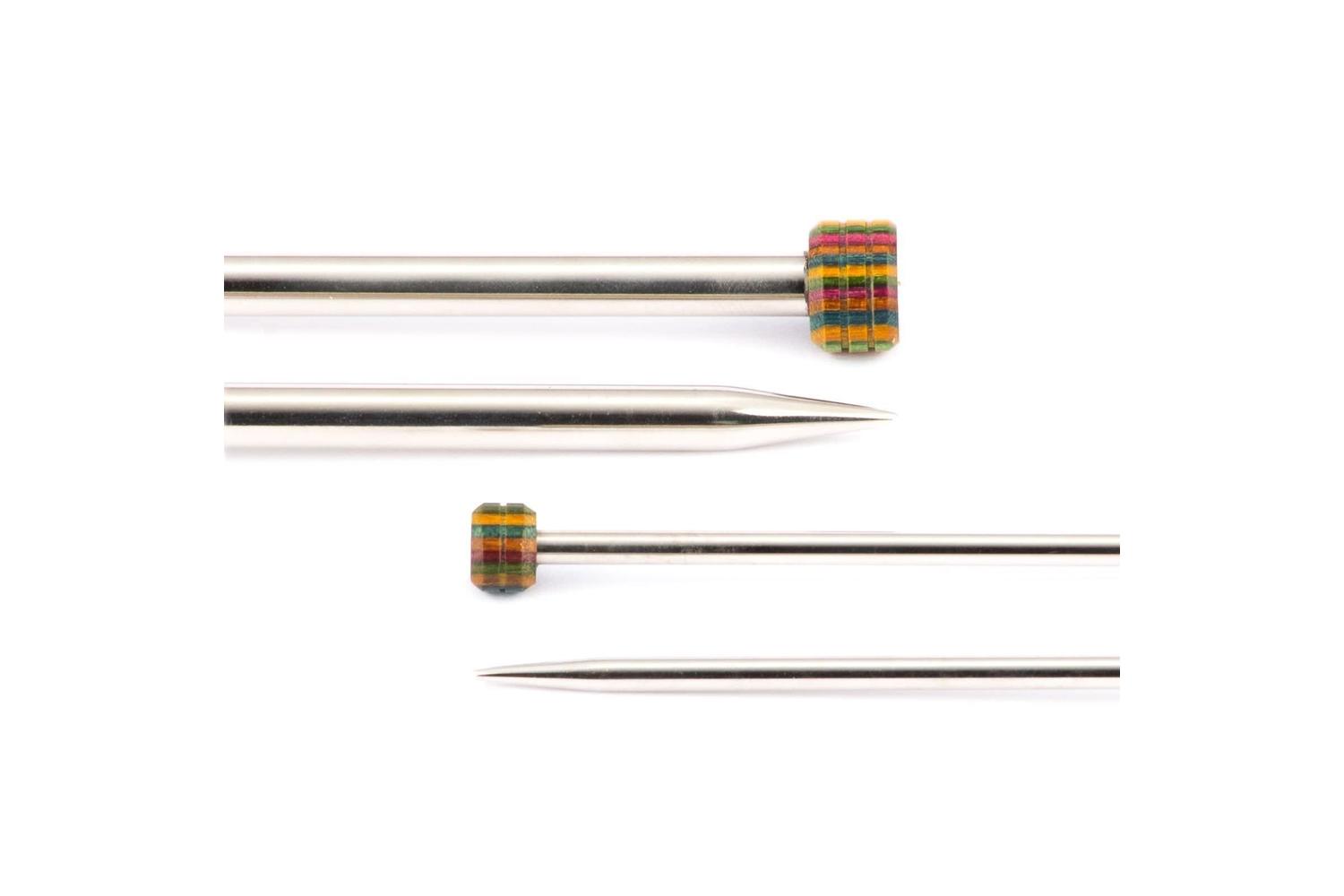 Description: These lightweight needles are made from solid brass pipes, which are electroplated with chrome. The heads are made of Symfonie wood. A smooth finish and sharp tips allow for precise, neat stitches.