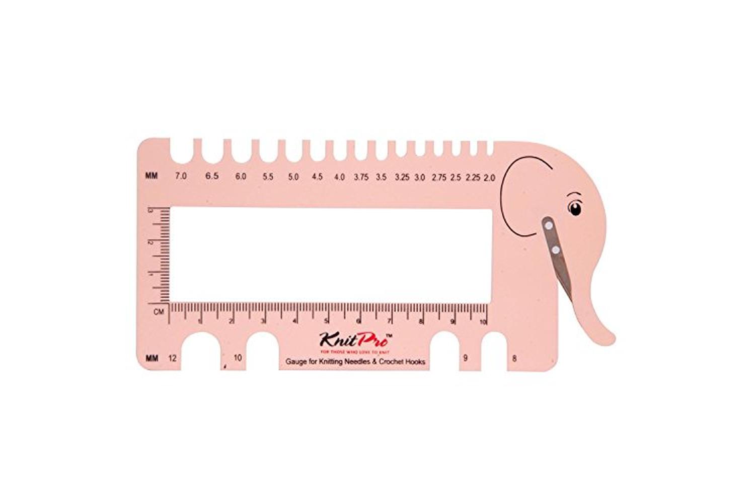 A fun, elephant shaped ruler/sizer. Easily measure the sizes of knitting pins and crochet hooks. Includes handy yarn cutter and rulers for measuring knitted/crocheted pieces.