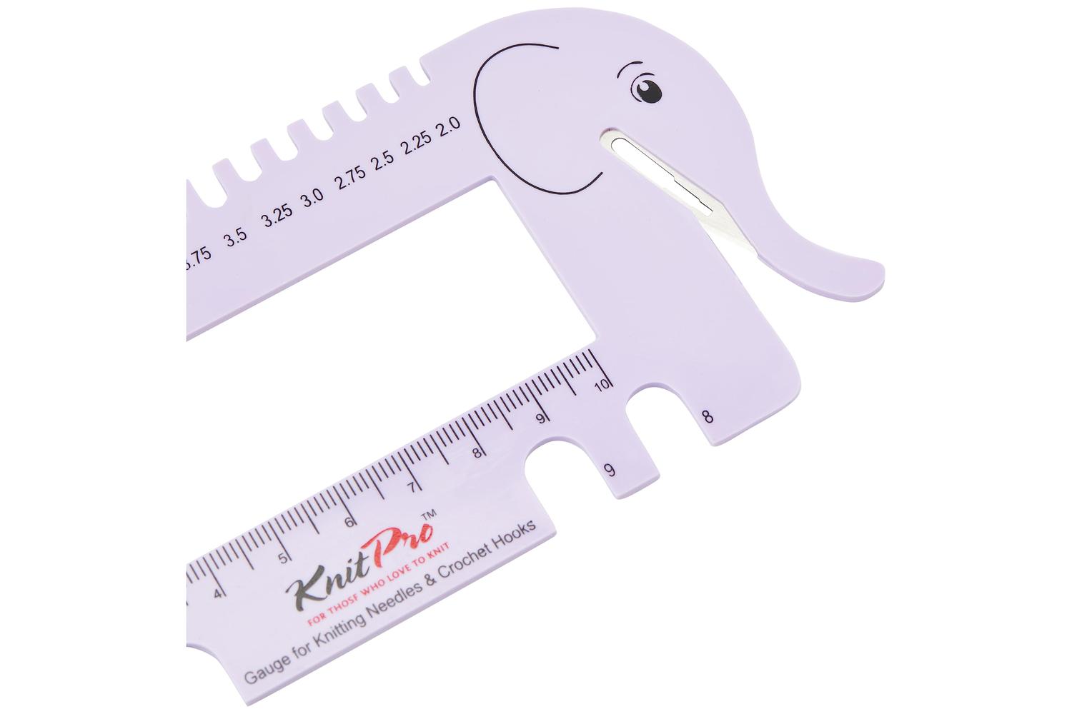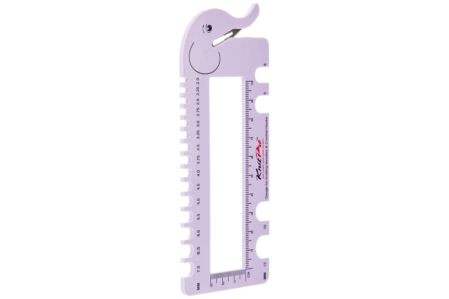 A fun, elephant shaped ruler/sizer. Easily measure the sizes of knitting pins and crochet hooks. Includes handy yarn cutter and rulers for measuring knitted/crocheted pieces.