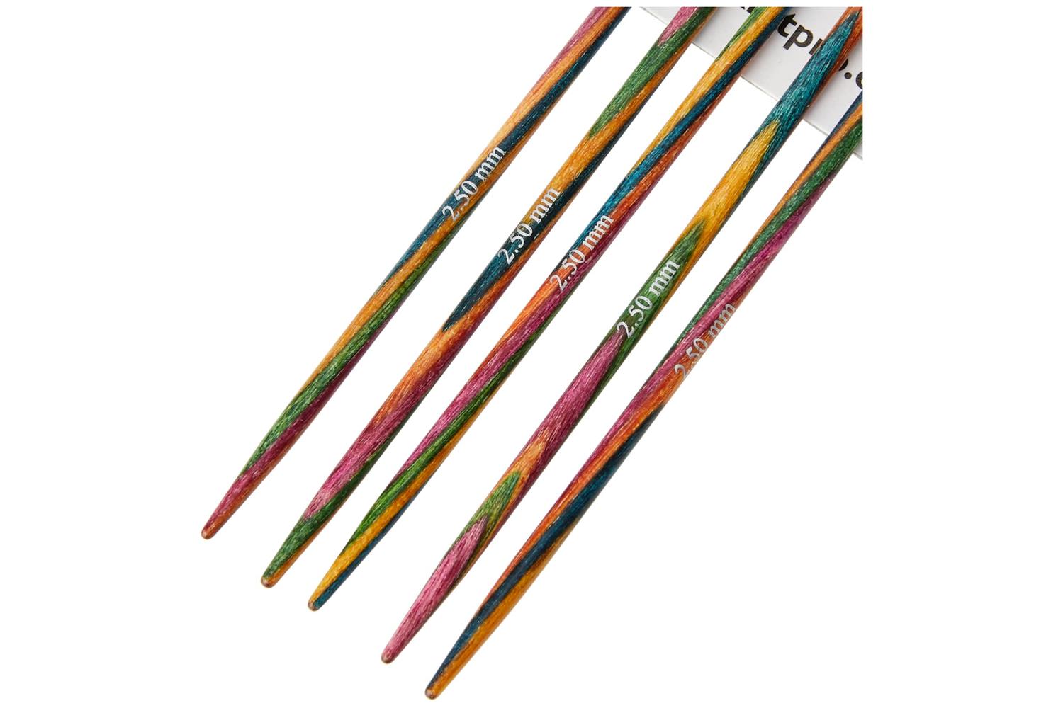 Description: These popular multi-coloured needles are made from compact laminated Birchwood and provide a strong and durable finish. The smooth and sharp tapered tips are ideal for creating tubes of knitting such as socks, gloves, hats and scarves, etc. Set of 5.