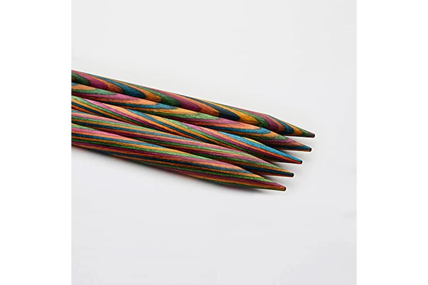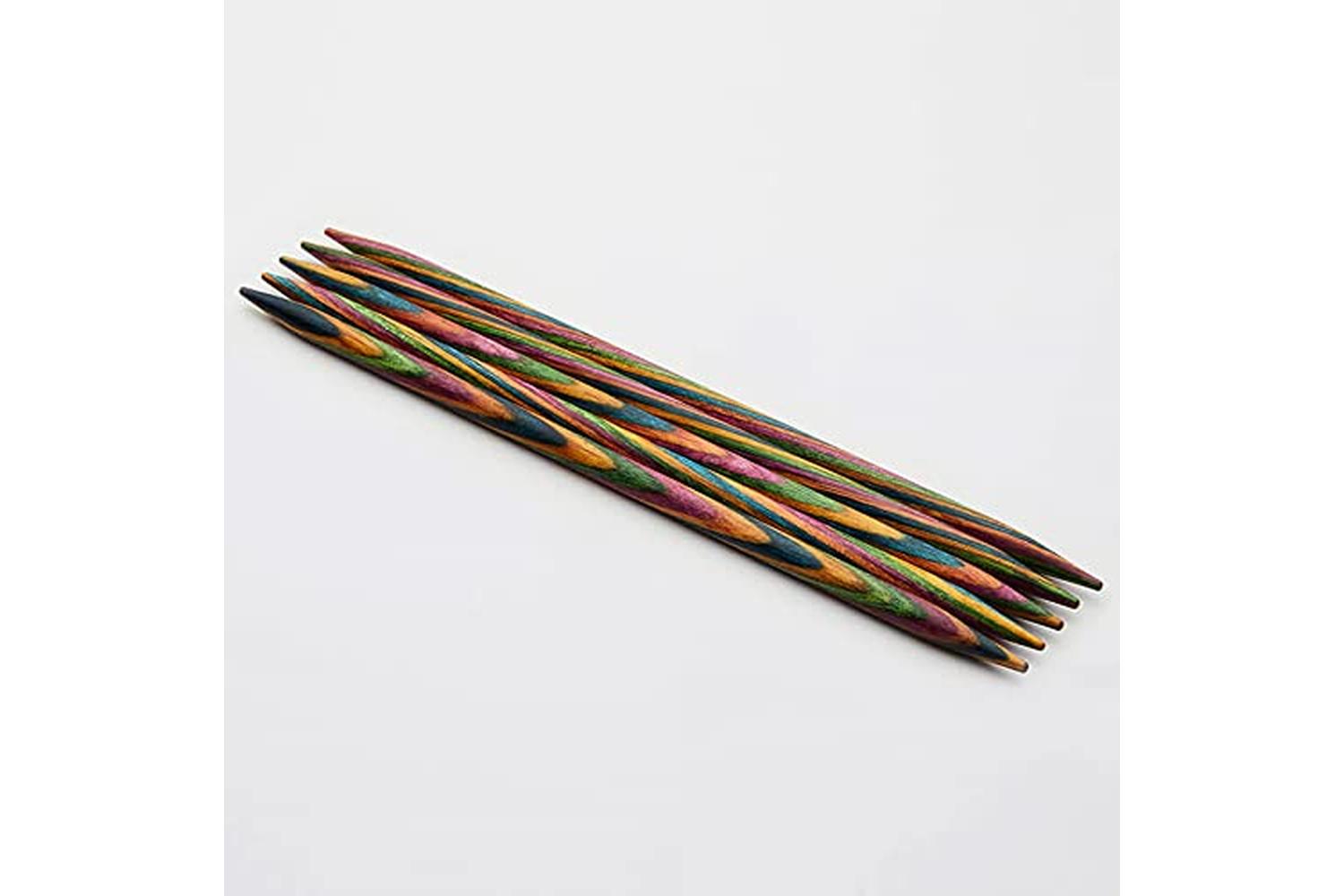 Description: These popular multi-coloured needles are made from compact laminated Birchwood and provide a strong and durable finish. The smooth and sharp tapered tips are ideal for creating tubes of knitting such as socks, gloves, hats and scarves etc. Set of 5.