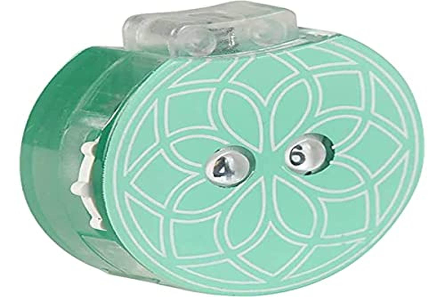 Description: Clicky row counter. Helps keep track of rows. Easy to see numbers. Teal coloured case with coordinating mandala design on top. Packaged in drawstring cotton case. Environmentally friendly packaging, using natural materials.