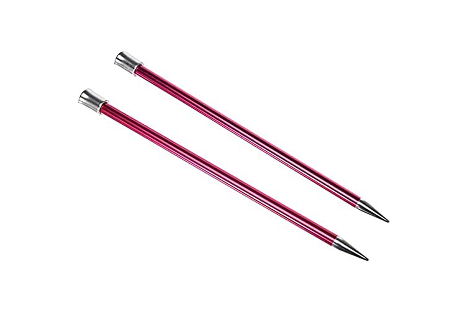 Description: Aluminium knitting pins in a spectrum of bright and lively colours with beautiful silver tips. The lustrous metallic shades are specific to different sizes.