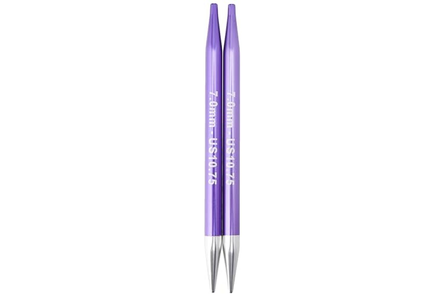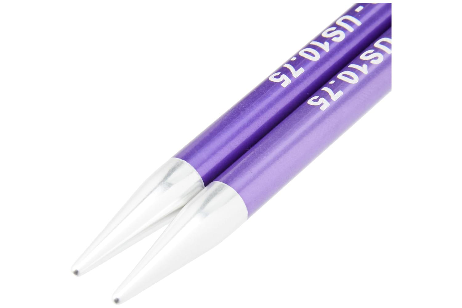 Aluminium knitting pins in a spectrum of bright and lively colours with beautiful silver tips. The lustrous metallic shades are specific to different sizes.