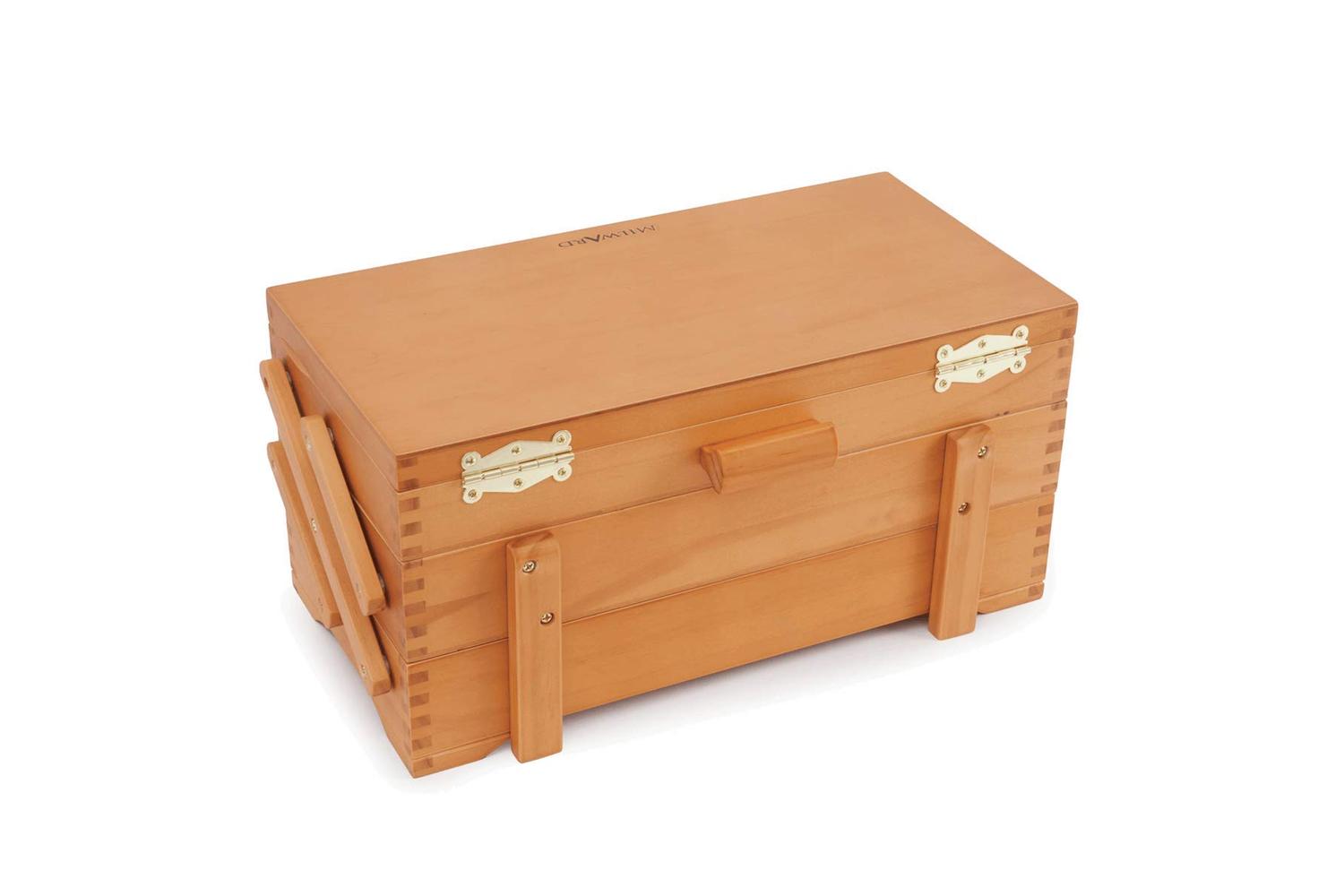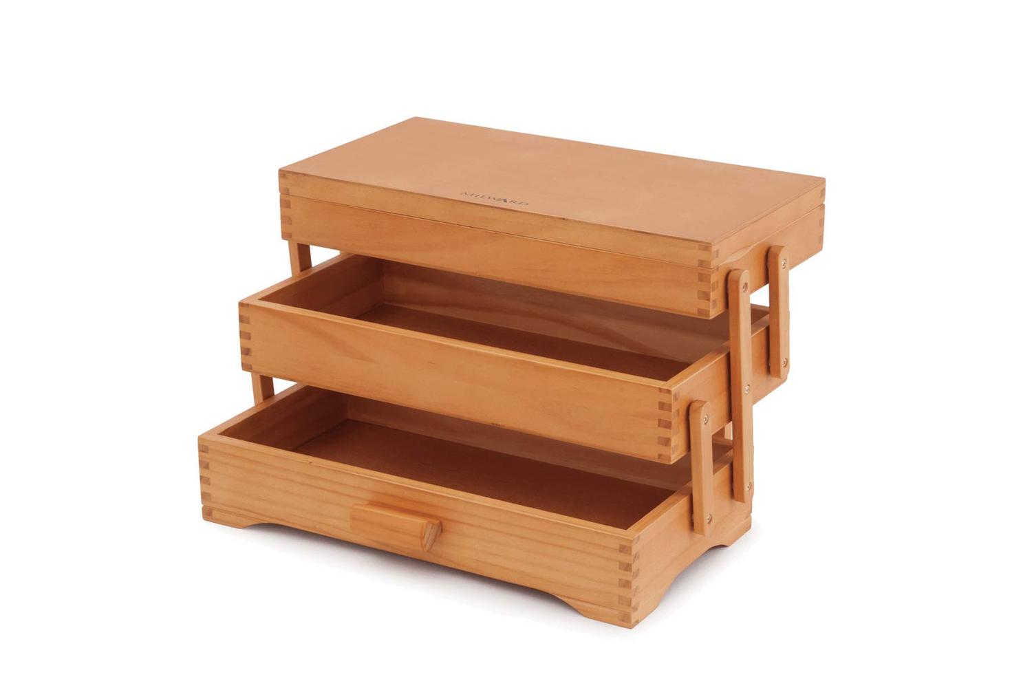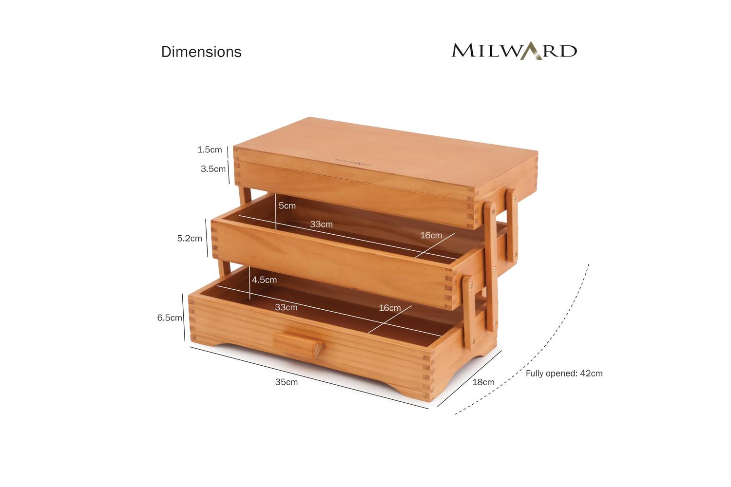 Made from pine wood. Special legs to support and stabilise the box when fully open. Magnetic fastening closure on lid. Top drawer has divisions for storing smaller items such as bobbins, needles etc. Wooden handles to facilitate opening. Laser etched with Milward logo.