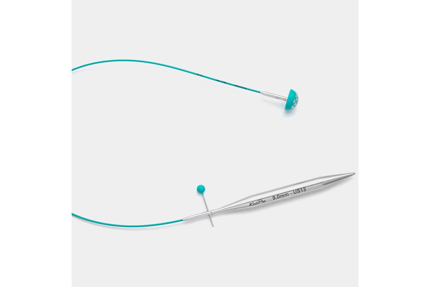 20cm/8in, to make a 40cm/16in interchangeable needle. Strong and flexible cable, for use with all KnitPro interchangeable circular knitting pins. Made from the finest grade stainless steel strands and coated in silky smooth nylon in a soothing teal colour. Importantly, they are 'memory free', and can swivel 360°, so there is no annoying twisting. The teal coloured end-caps carrying the mandala print, ensure that works stays put on the cable should it be necessary to remove a needle. The cable keys, used for tightening the tips to the cable, have a colour coordinated top. Environmentally friendly packaging, using natural materials.