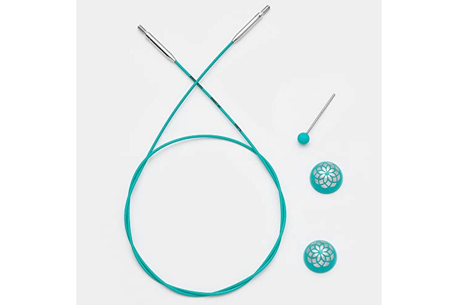 56cm/22in, to make a 80cm/32in interchangeable needle. Strong and flexible cable, for use with all KnitPro interchangeable circular knitting pins. Made from the finest grade stainless steel strands and coated in silky smooth nylon in a soothing teal colour. Importantly, they are 'memory free', so there is no annoying twisting. The teal coloured end-caps carrying the mandala print, ensure that works stays put on the cable should it be necessary to remove a needle. The cable keys, used for tightening the tips to the cable, have a colour coordinated top. Environmentally friendly packaging, using natural materials.