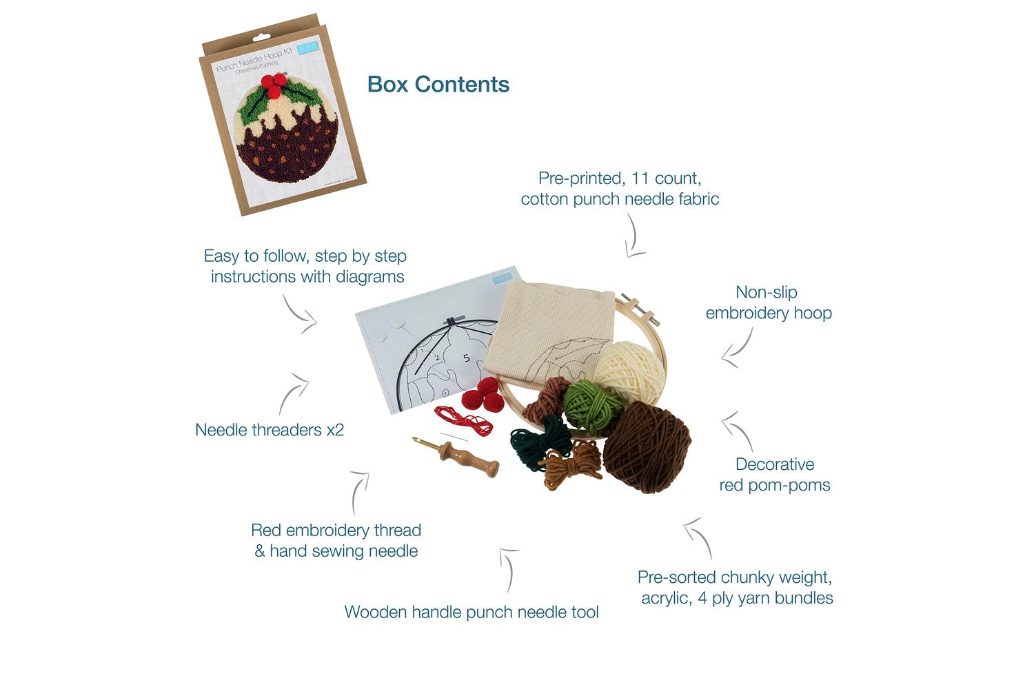 Description: These punch needle hoop kits are the perfect introduction to the art of needle punching and would make a perfect festive decoration or a unique gift.
