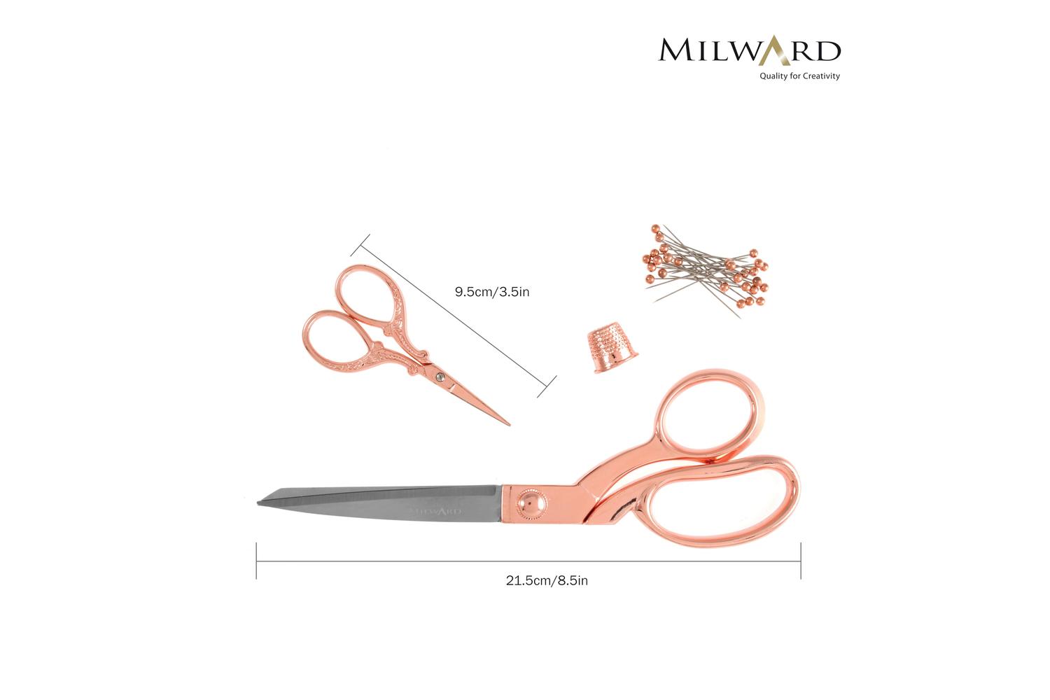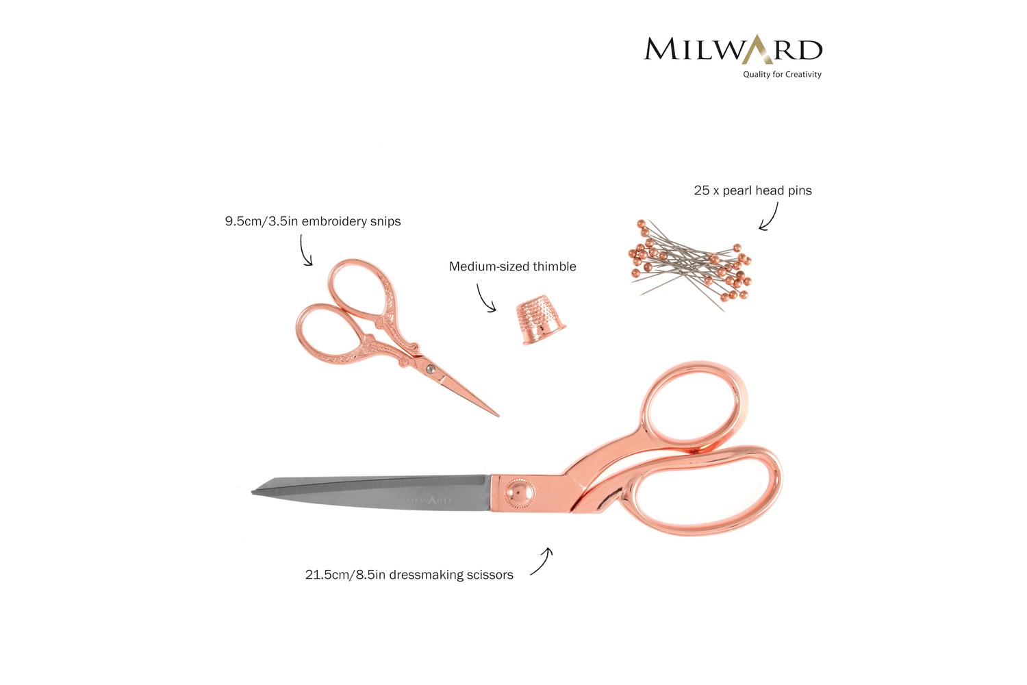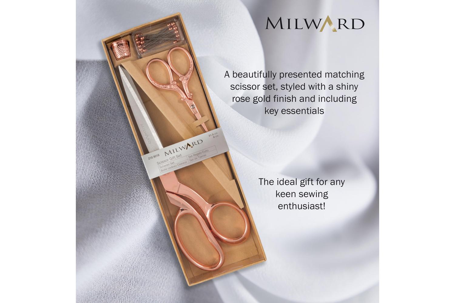 Beautiful Milward gift sets containing stylish coordinating accessories; perfect additions to any sewing box, any keen sewer would be delighted to receive this as a gift! High quality metal dressmaking scissors, 21.5cm (8.5in) with rose gold coloured handles; coordinating embroidery scissors 9.5cm (3.7in) with rose gold coloured handles; rose gold coloured thimble and 25 rose gold pearl headed pins.