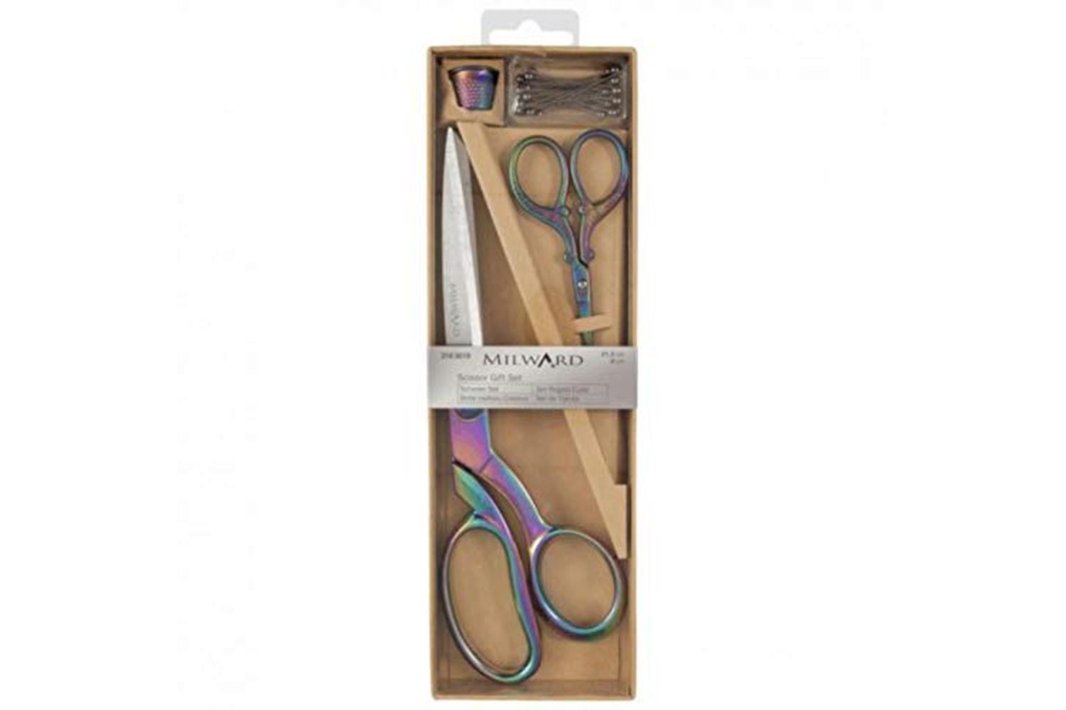Beautiful Milward gift sets containing stylish coordinating accessories; perfect additions to any sewing box, any keen sewer would be delighted to receive this as a gift! High quality metal dressmaking scissors, 21.5cm (8.5in) with rainbow effect handles; coordinating embroidery scissors 9.5cm (3.7in) with rainbow effect handles; rainbow effect thimble and 25 rainbow effect pearl headed pins.