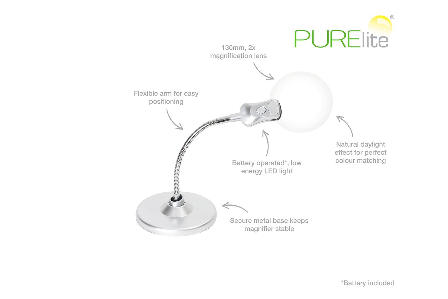Battery operated, no mains lead (bat incl). High power, low heat, low energy LED light. Natural daylight for good colour matching. 2X mag, Rimless 85mm lens ideal for close work. Flexible arm for easy positioning. Metal base keeps lamp stable.