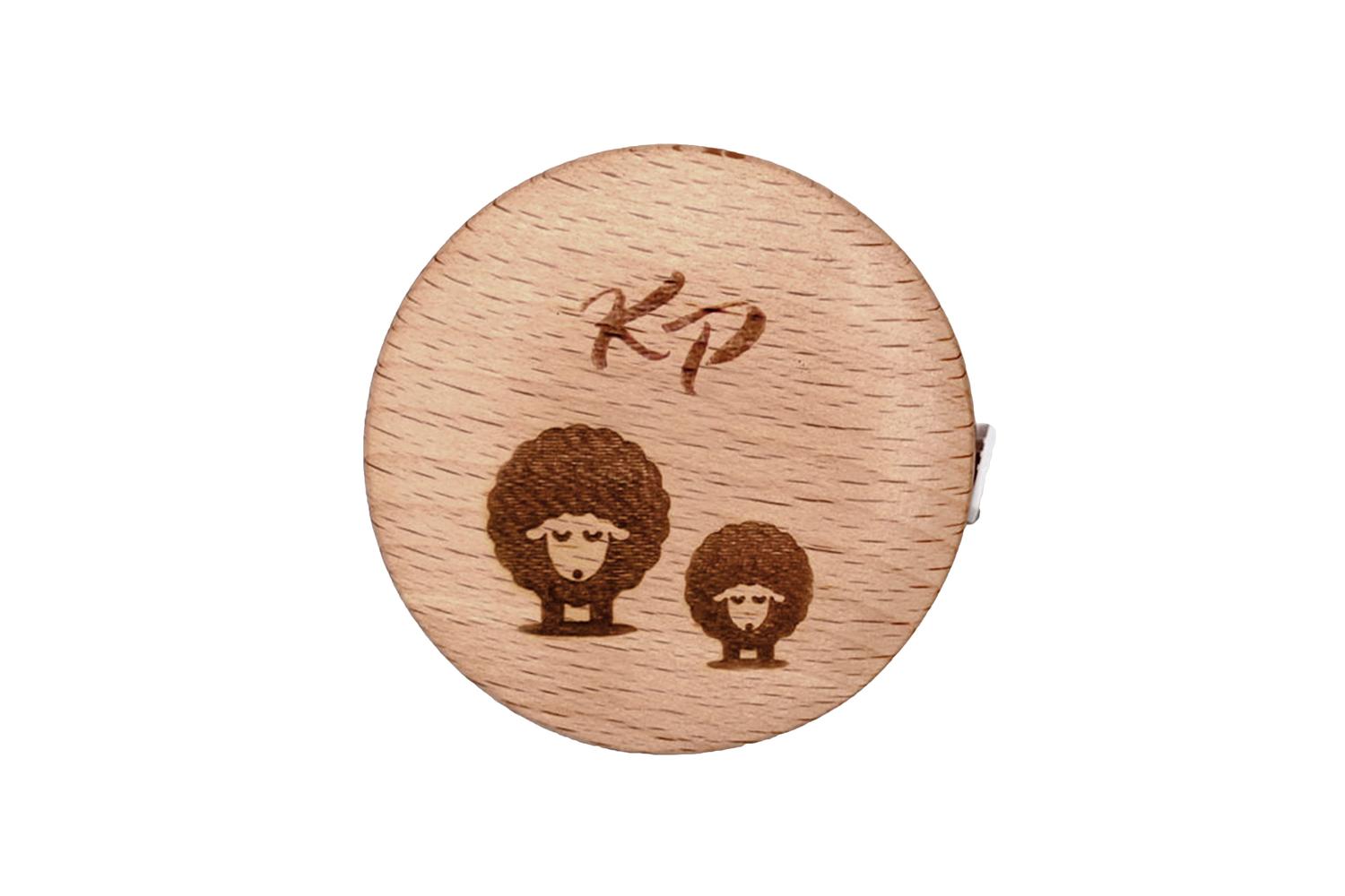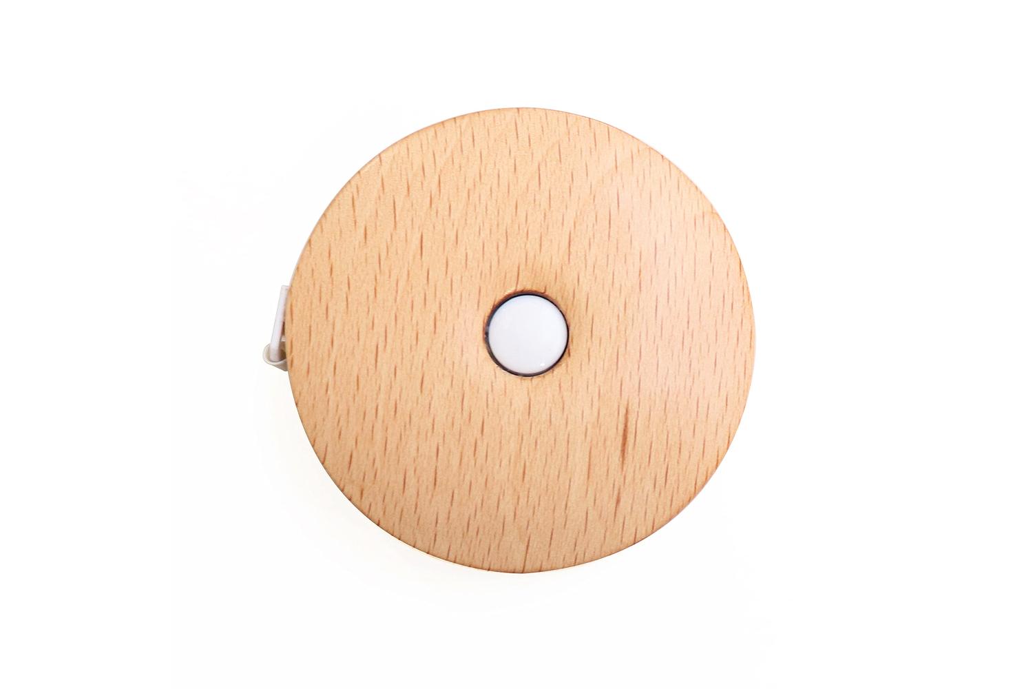 Description: Round retractable tape measure. Made from beech wood. 150cm / 60in.