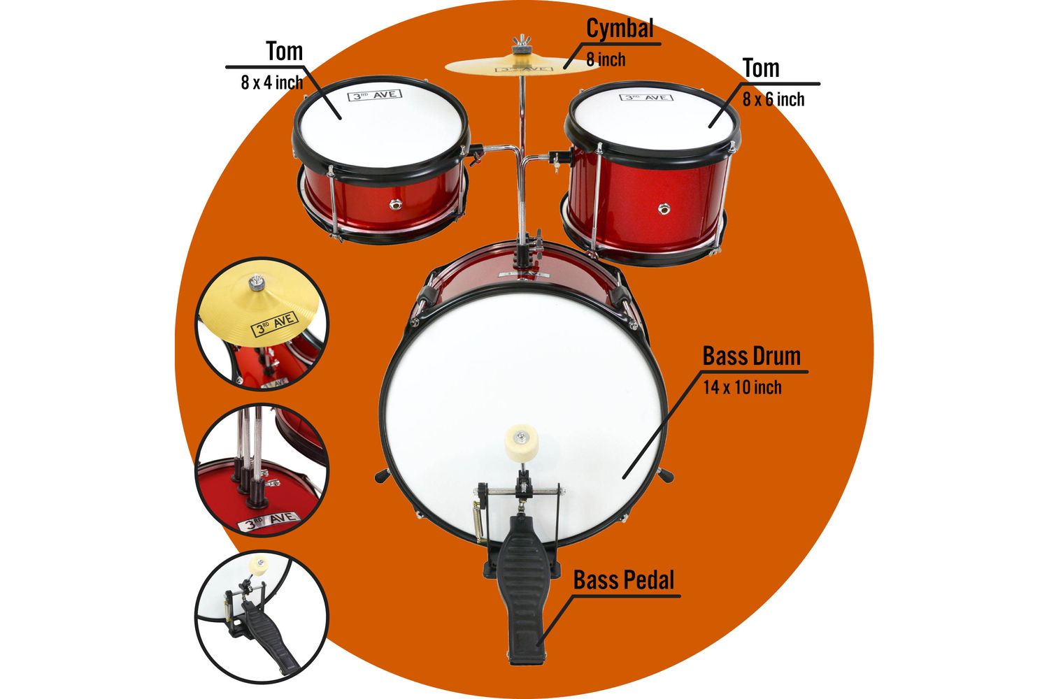 - Includes a 14" bass drum with pedal, two 8" toms, an 8" cymbal