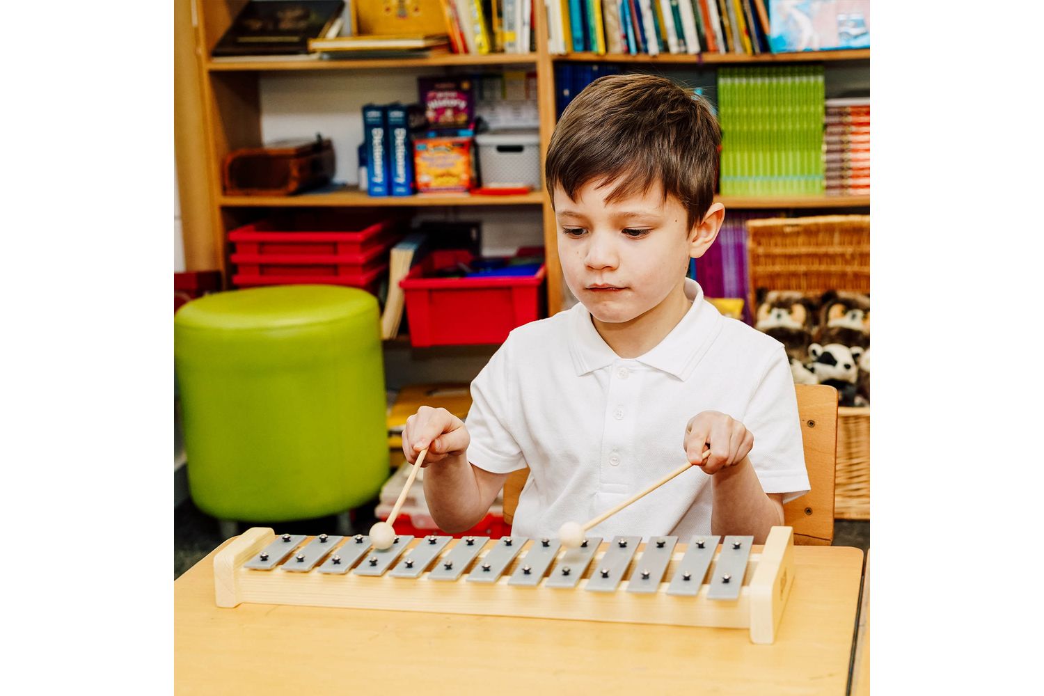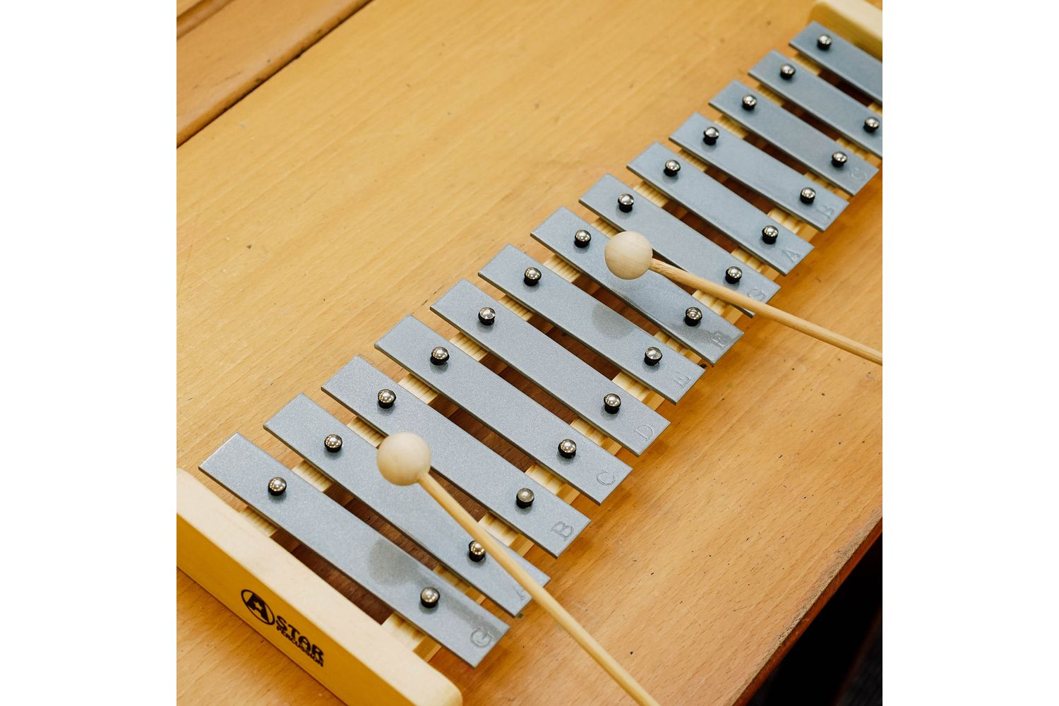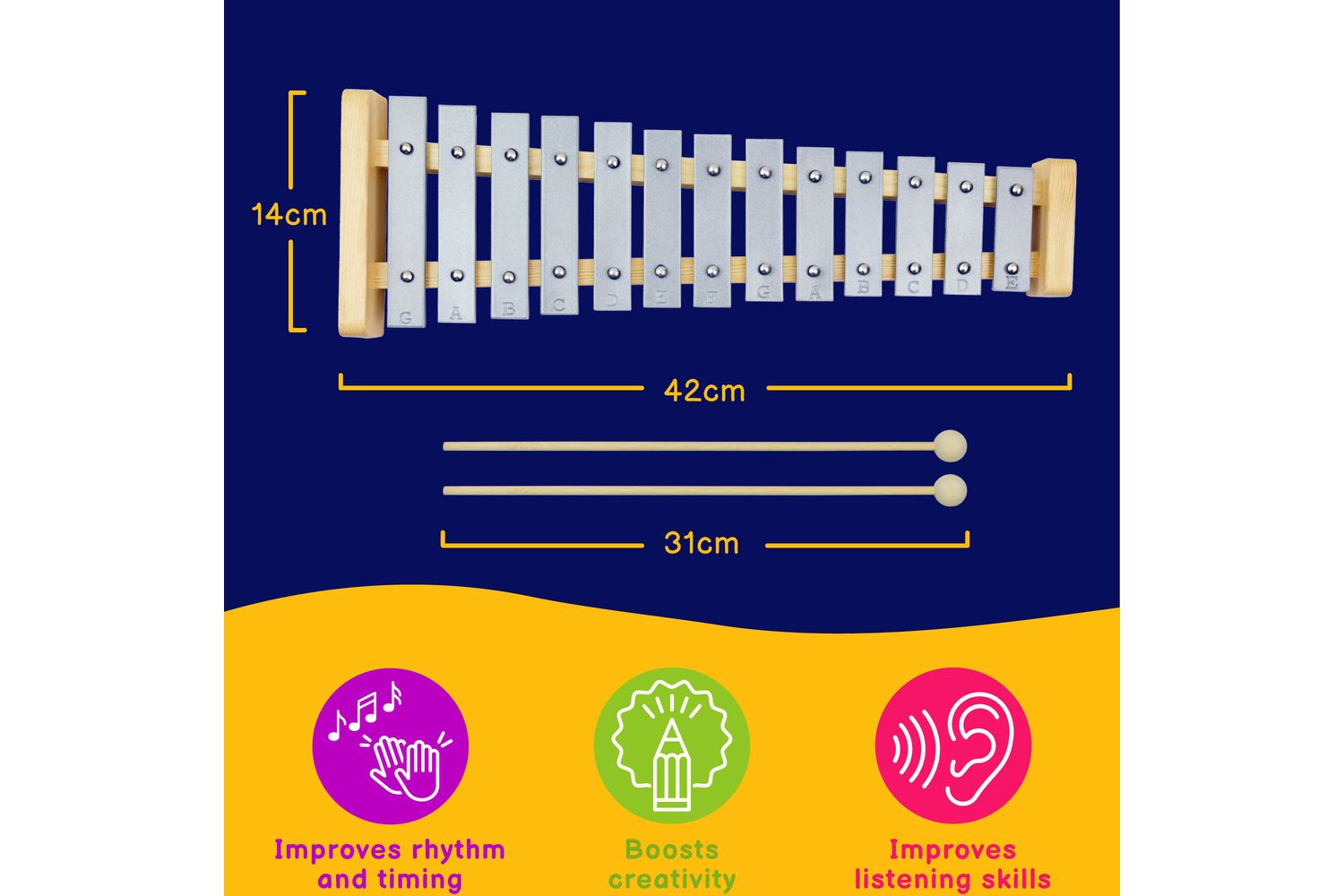 - 13-note metal glockenspiel producing clear, vibrant tones