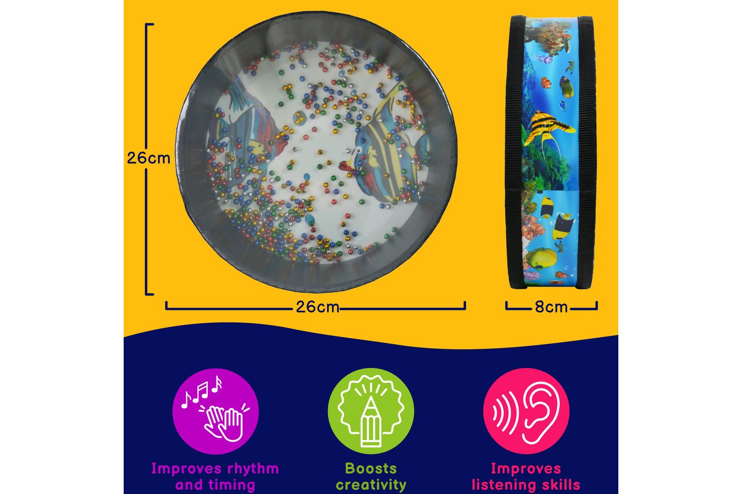 As descriptive as the name goes, this 10-inch ocean drum sits comfortably in your hands, arched with an aesthetically enchanting under-the-sea theme that just elevates it from being a mere musical tool to a marvellous work of art that sparks the creativity in you.