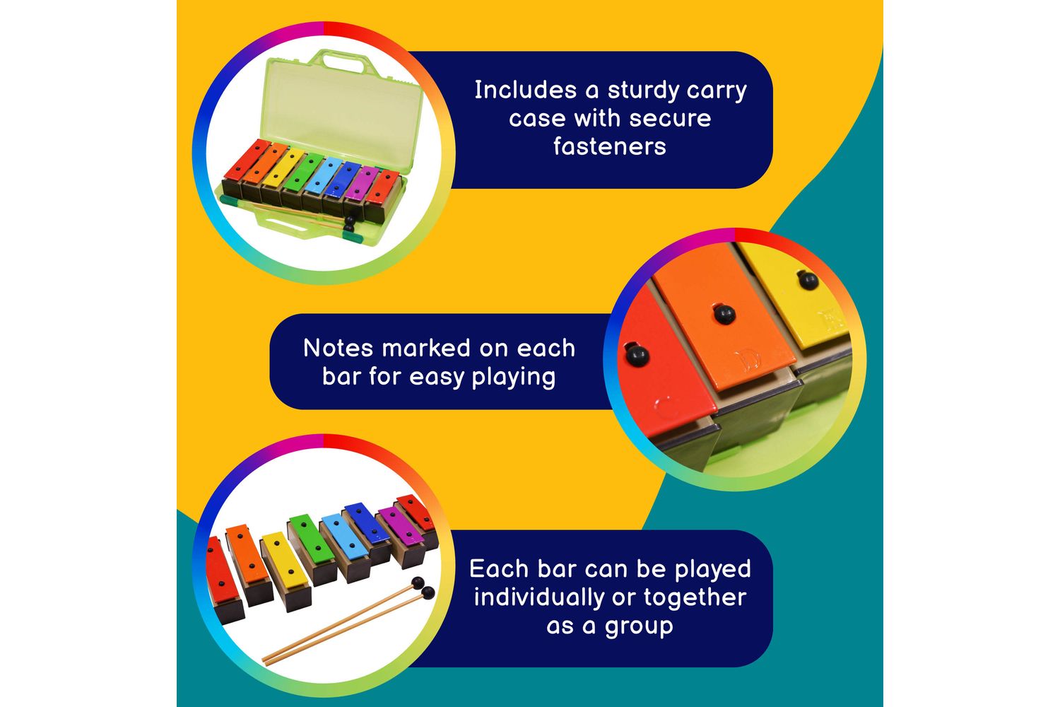 - Each bar comes with its colour, note letter name, and number – for simpler identification and fun learning.