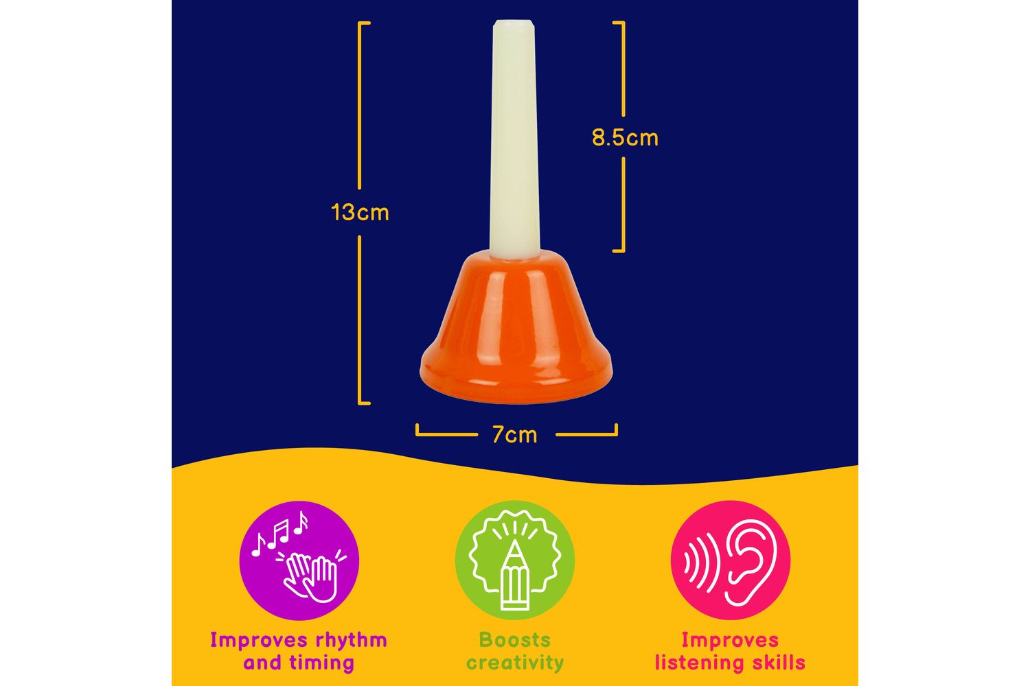 Wherever the sight, the applause-worthy A-Star hand bells draw attention with their rainbow-like assortment of colour. The set of 8 multi-coloured bells add a lively spark whether to a monotonous day at school or an inspiring evening of intense band practice. Coming in a compact size with each bell of 14cm height and a diameter of 7.5cm, they ensure convenient handling, packing, and transporting.