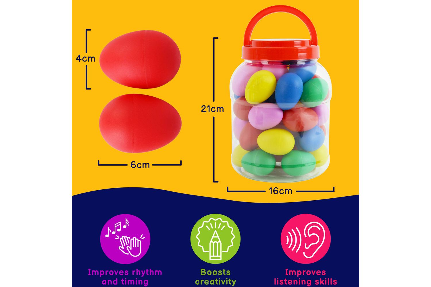A robust storage tub with a handle is also provided, offering a convenient solution for tidying up post-play. It makes for easy transport too, whether relocating around the school or taking the egg shakers on a trip.