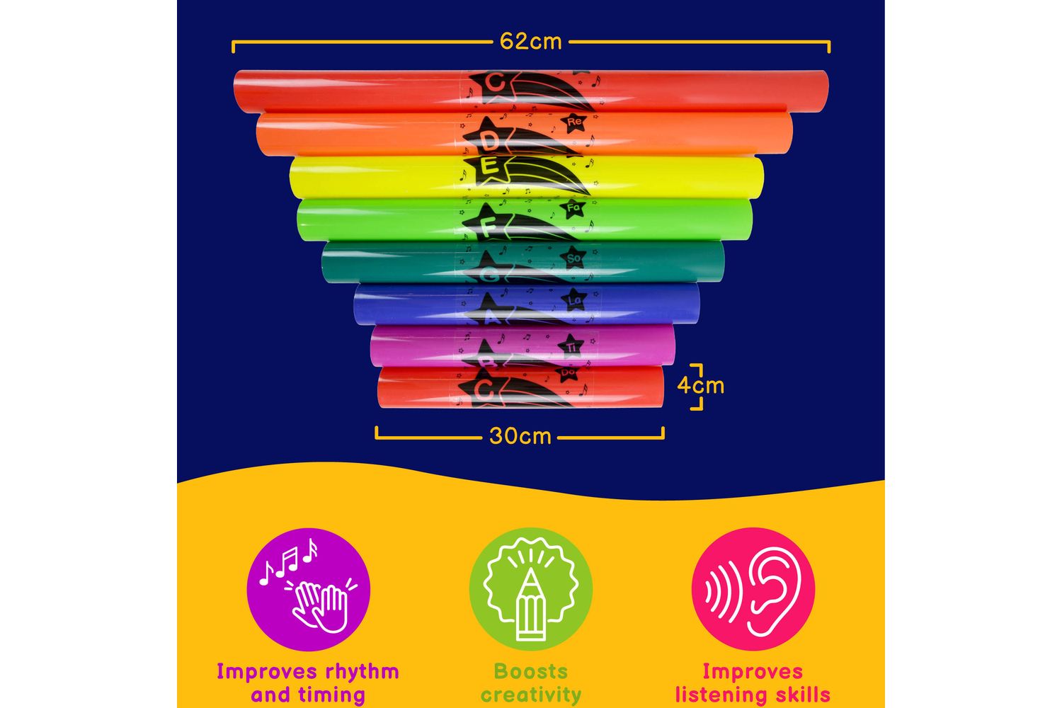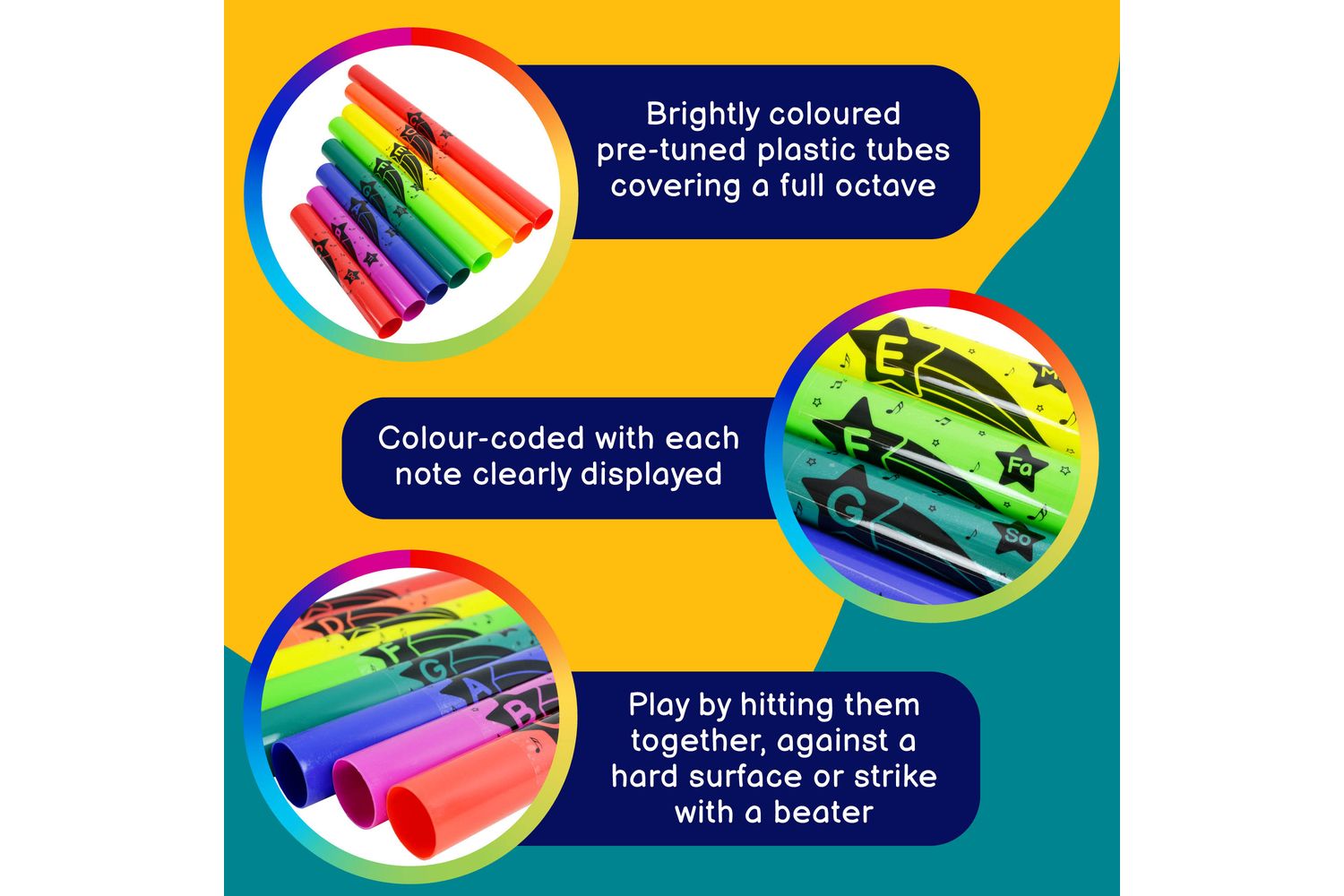 - 8 Sound Tubes structured in a complete set - C, D, E, F, G, A, B, and High C.