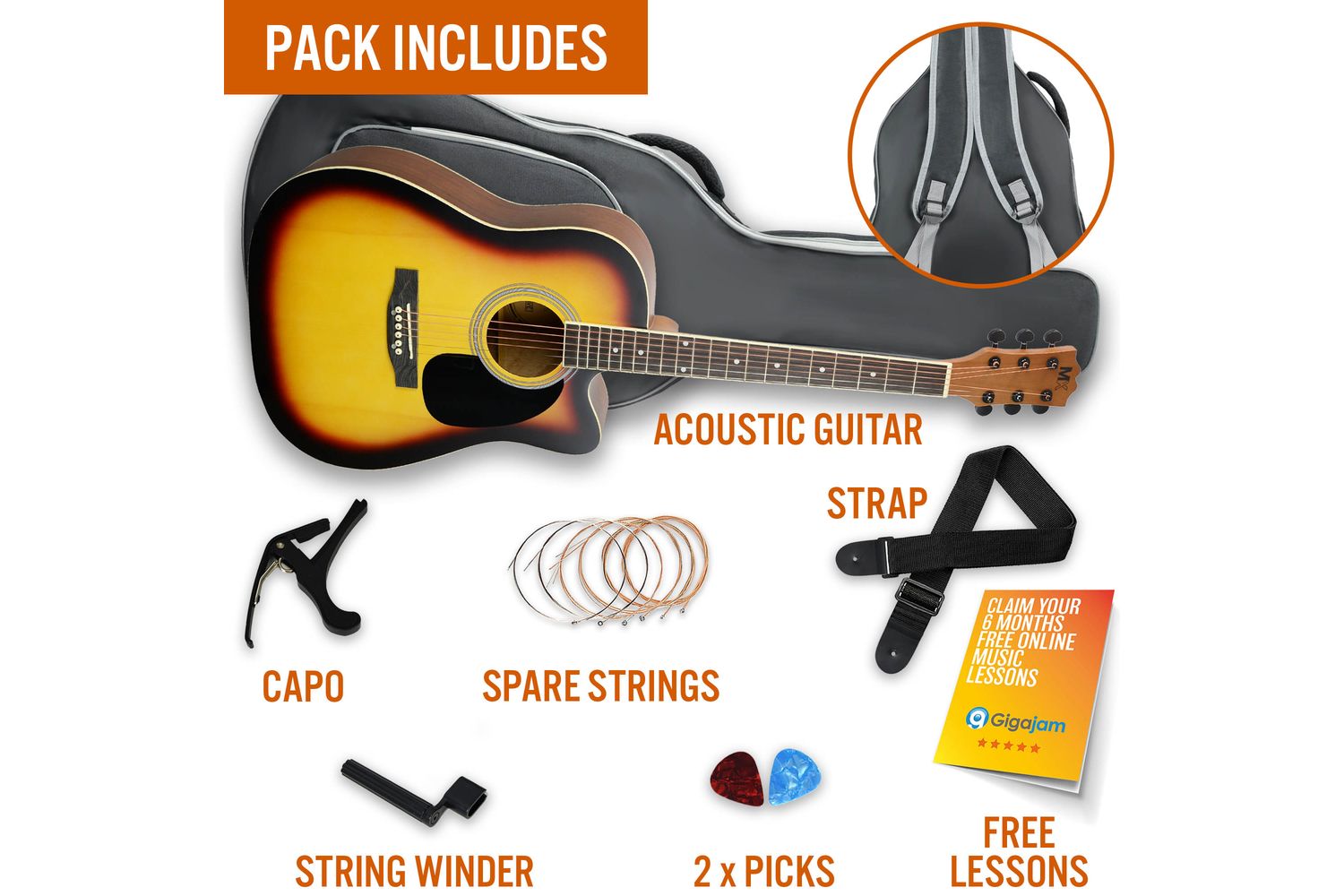 Experience first-class music renditions with the MX Cutaway Acoustic Guitar Pack - Sunburst by 3rd Avenue! This wonderful full-size guitar emerges as a perfect choice for both neophyte strummers and experienced players looking for an upgraded guitar model. Wholly designed by our deft experts, this guitar will take any player's musical journey a notch higher in an instant.