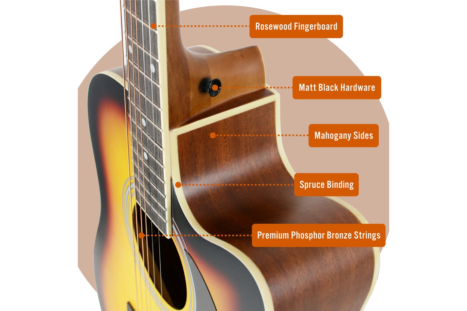 This marvelous MX Cutaway Acoustic Guitar Pack in sunburst was designed by 3RD AVENUE, with the Irish music lovers in mind - prioritizing exceptional playability, impressive sound, and broad functionality. It's time to level up your performance game!