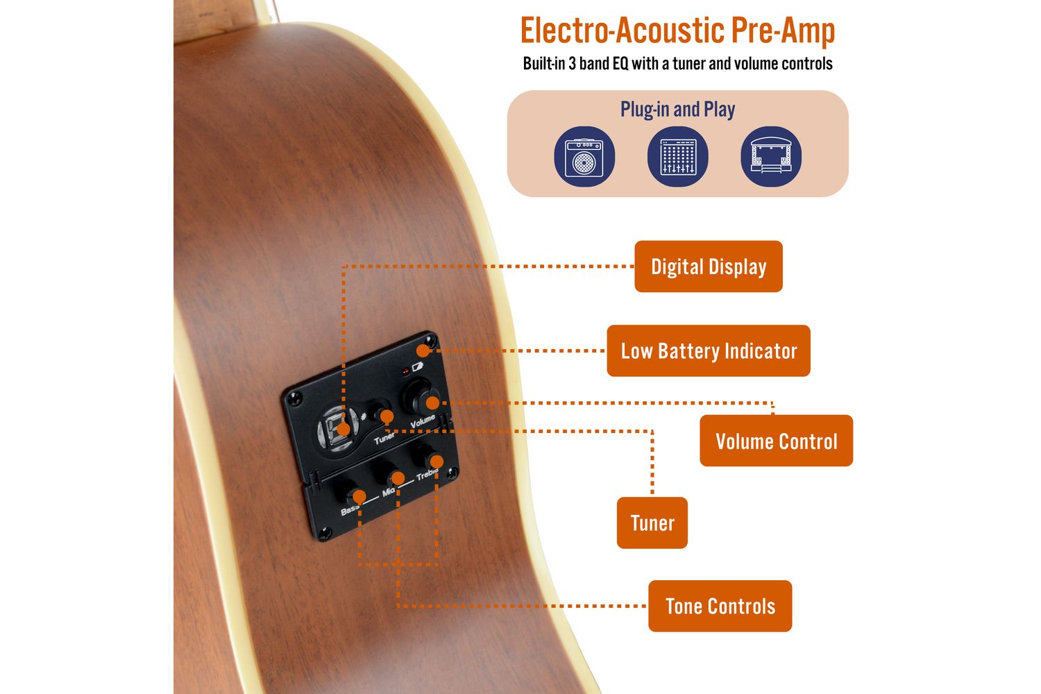 >Enhancing your aural experiment, it shines with a 3-band EQ and volume control at your fingertips. This comes with a built-in tuner, digital display, sparing you the trouble of accessory overload, rather delivers a fine-tuned, appealing sound effect. The cutaway body shape isn't just a style statement, rather a path for you to reach the higher frets without restriction.