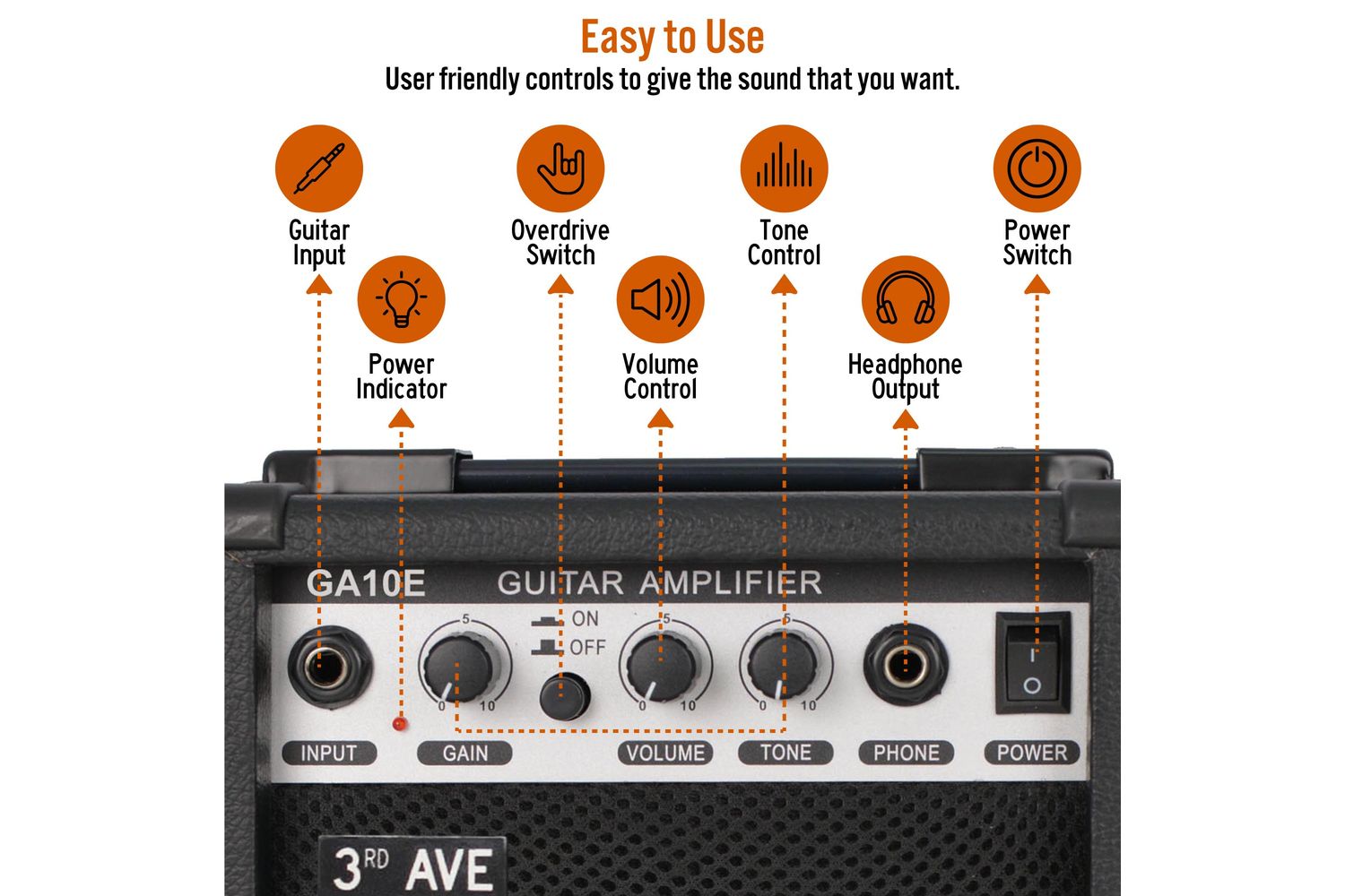 With this robust and durable amplifier, you get absolute control over your sound. Use the intuitive tone control feature to customize from a warm, deep resonance to a bright, high note. Gain absolute mastery over your sound's distortion with the overdrive switch and utilize the gain dial for a specific level of “crunch.”