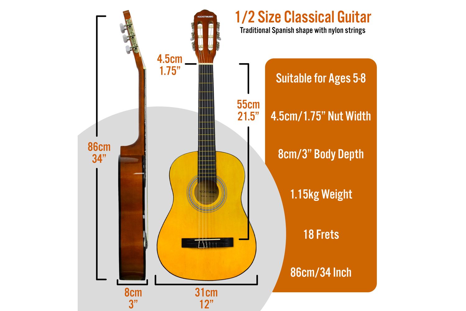 - 1/2 size Classical Spanish guitar with nylon strings