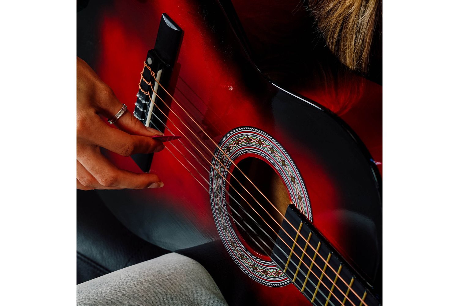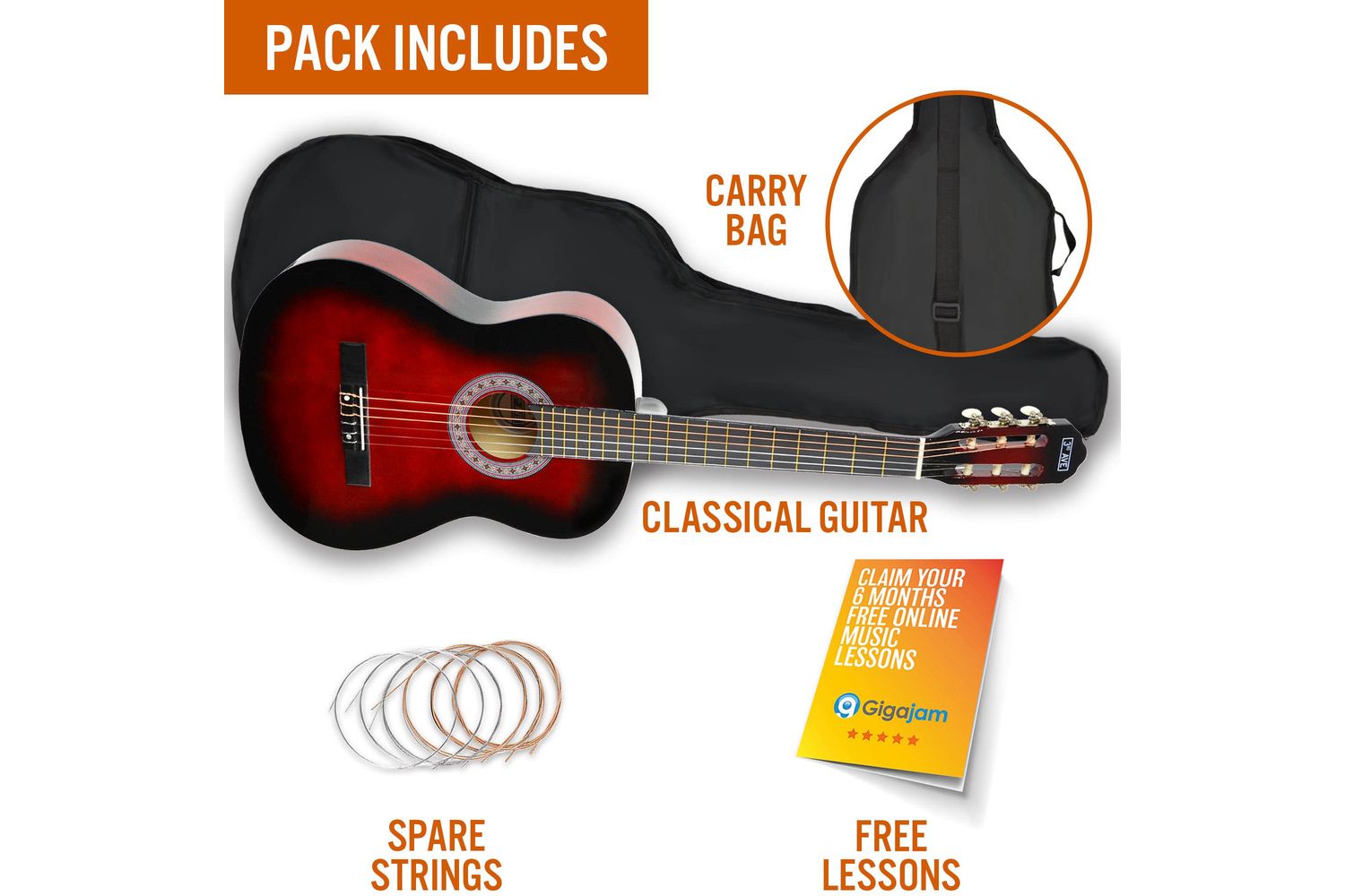 Kickstart your musical journey with the 3rd Avenue 34 Size Classical Guitar Pack in a striking Redburst finish. A fantastic choice for beginners, this 3rd Avenue bundle features everything you need to start strumming immediately, offering not just a handcrafted classical Spanish guitar but also essential accessories such as a lightweight carry bag and set of spare nylon strings.