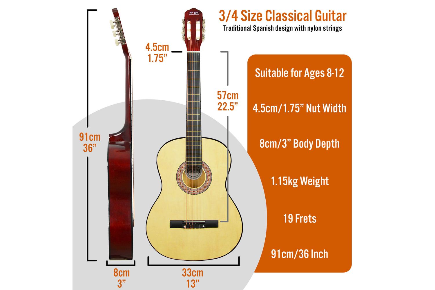 This 3/4 size Classical Guitar set, with its striking length of 36"/91cm and a scale length of 22.5"/57cm, offers optimal playability. It comes with an easy Bailey dyed maple fretboard embedded with 19 frets, promising ultimate user gratification. The added specifications of discrete body width of 13"/33cm and nut width of 1.75"/4.5cm enhance its physical characteristics.